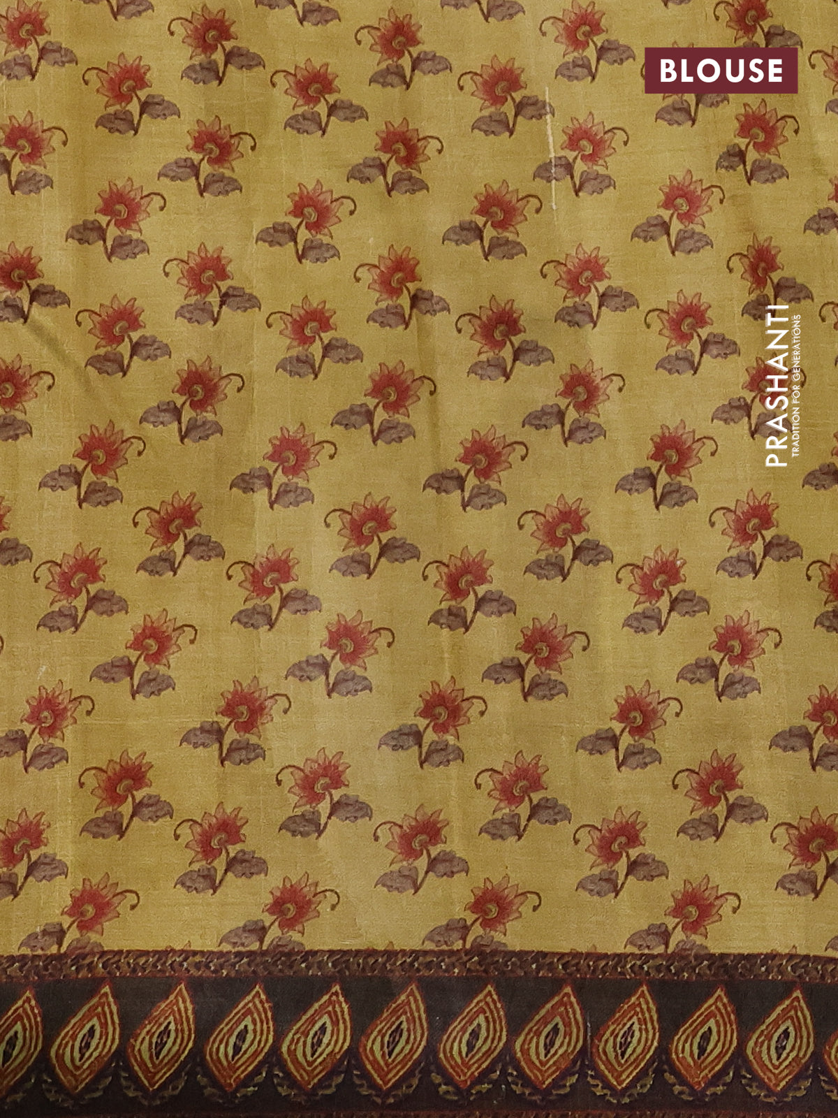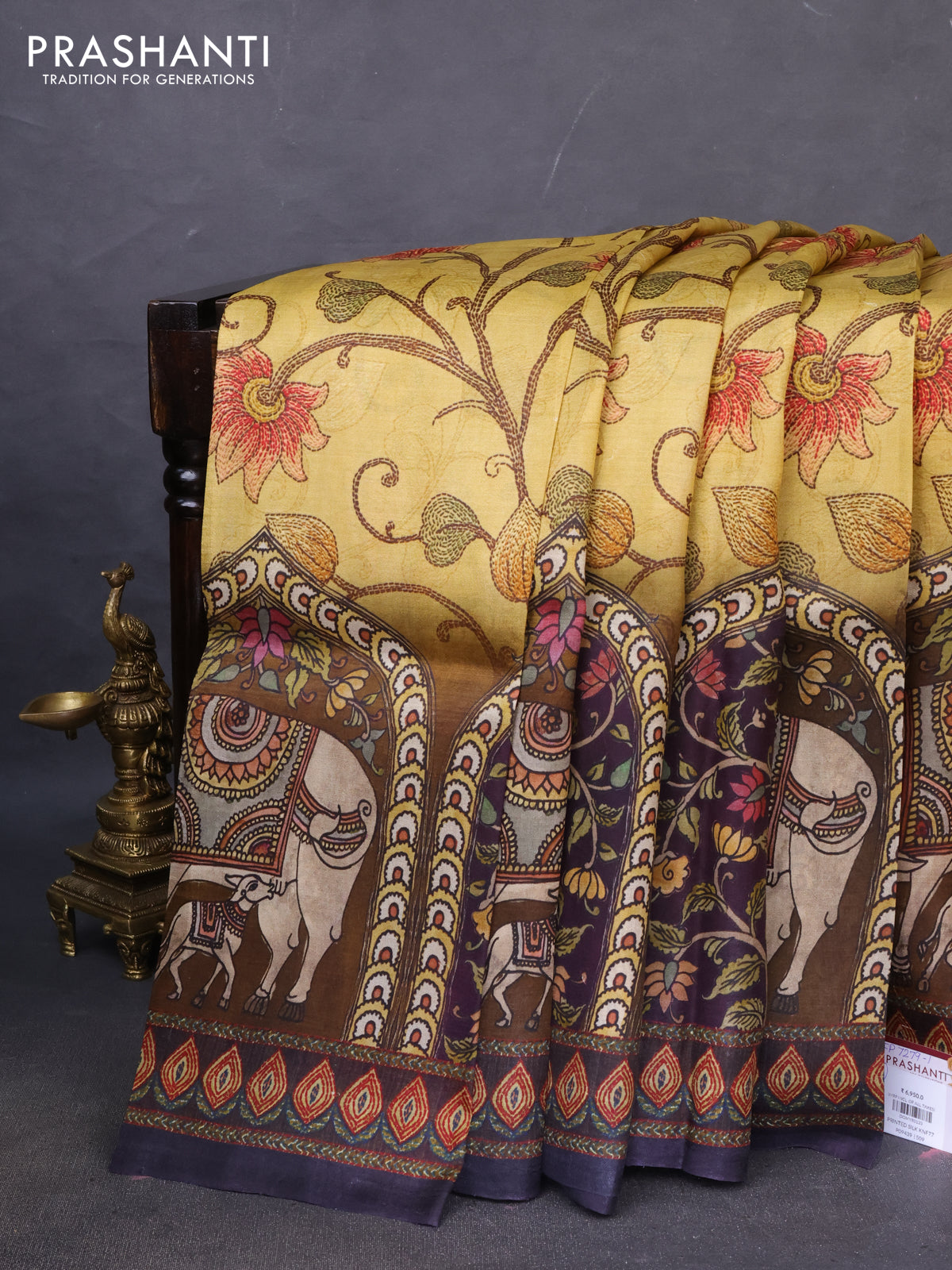 Printed silk saree mustard yellow and brown with allover madhubani prints and long printed border