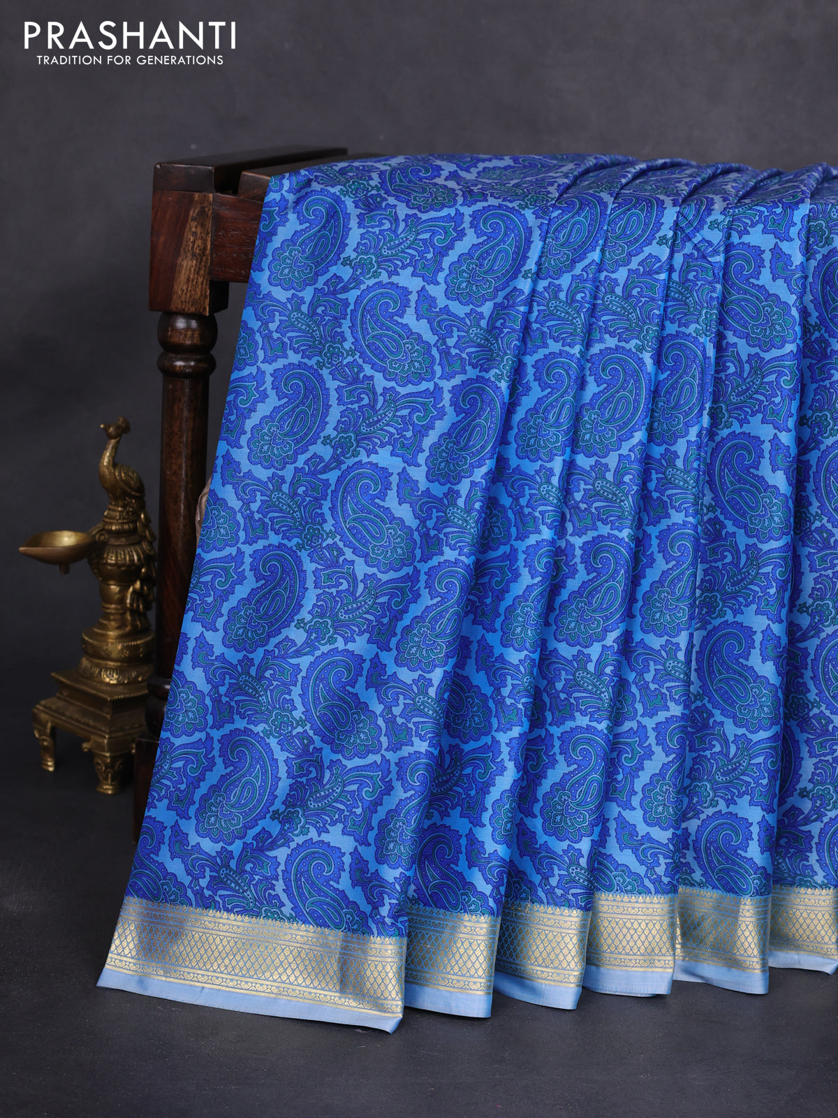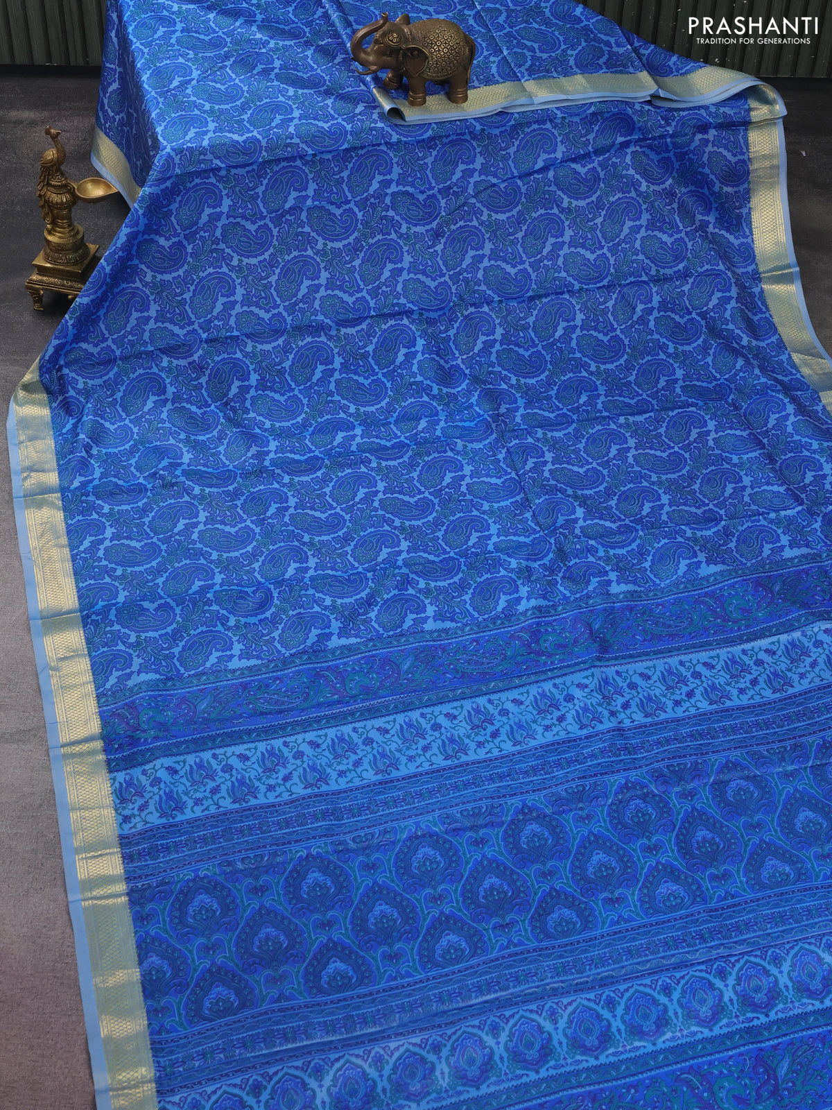 Printed silk saree pastel blue and royal blue with allover paisley prints and zari woven border