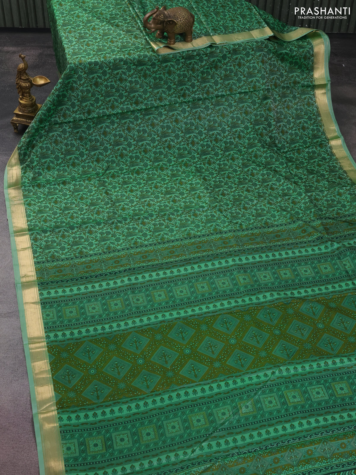 Printed silk saree pastel green with allover prints and zari woven border