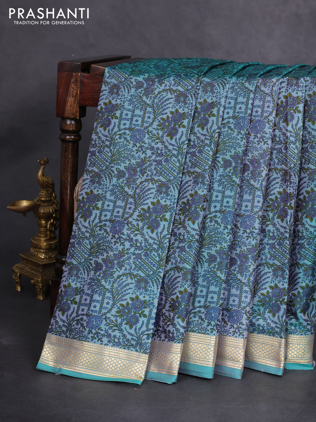 Printed silk saree teal blue with allover prints and zari woven border