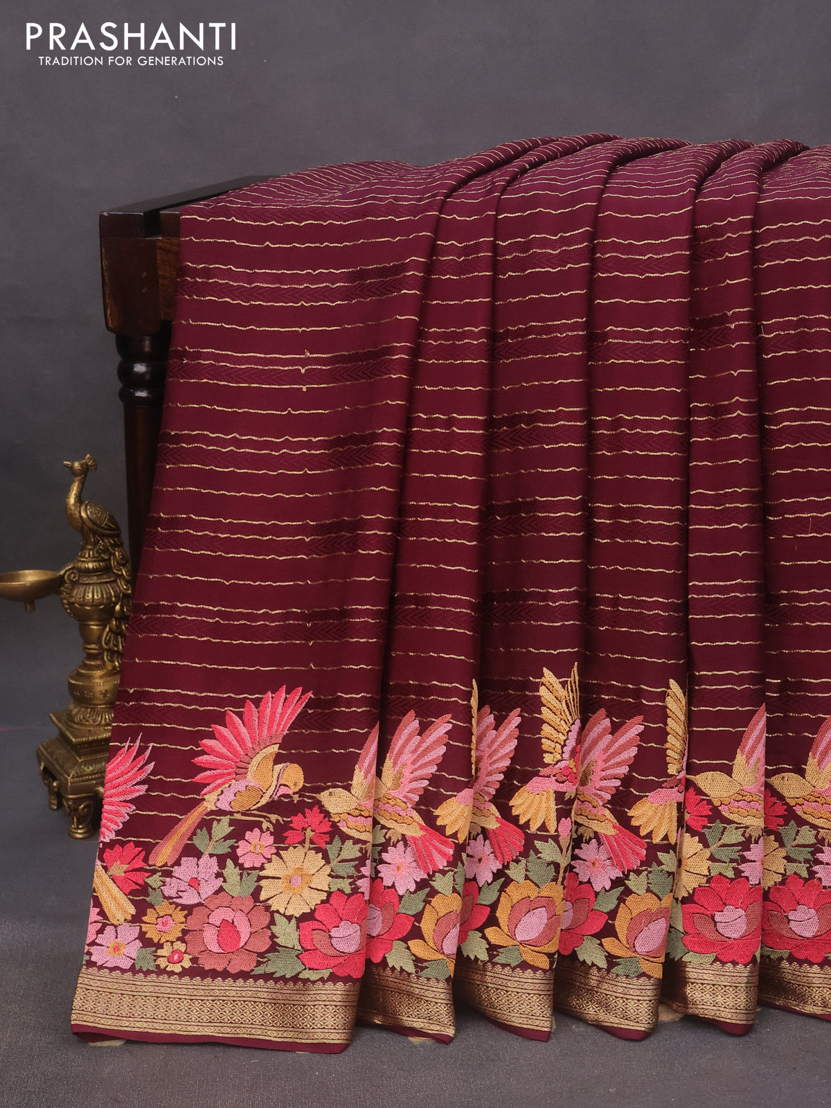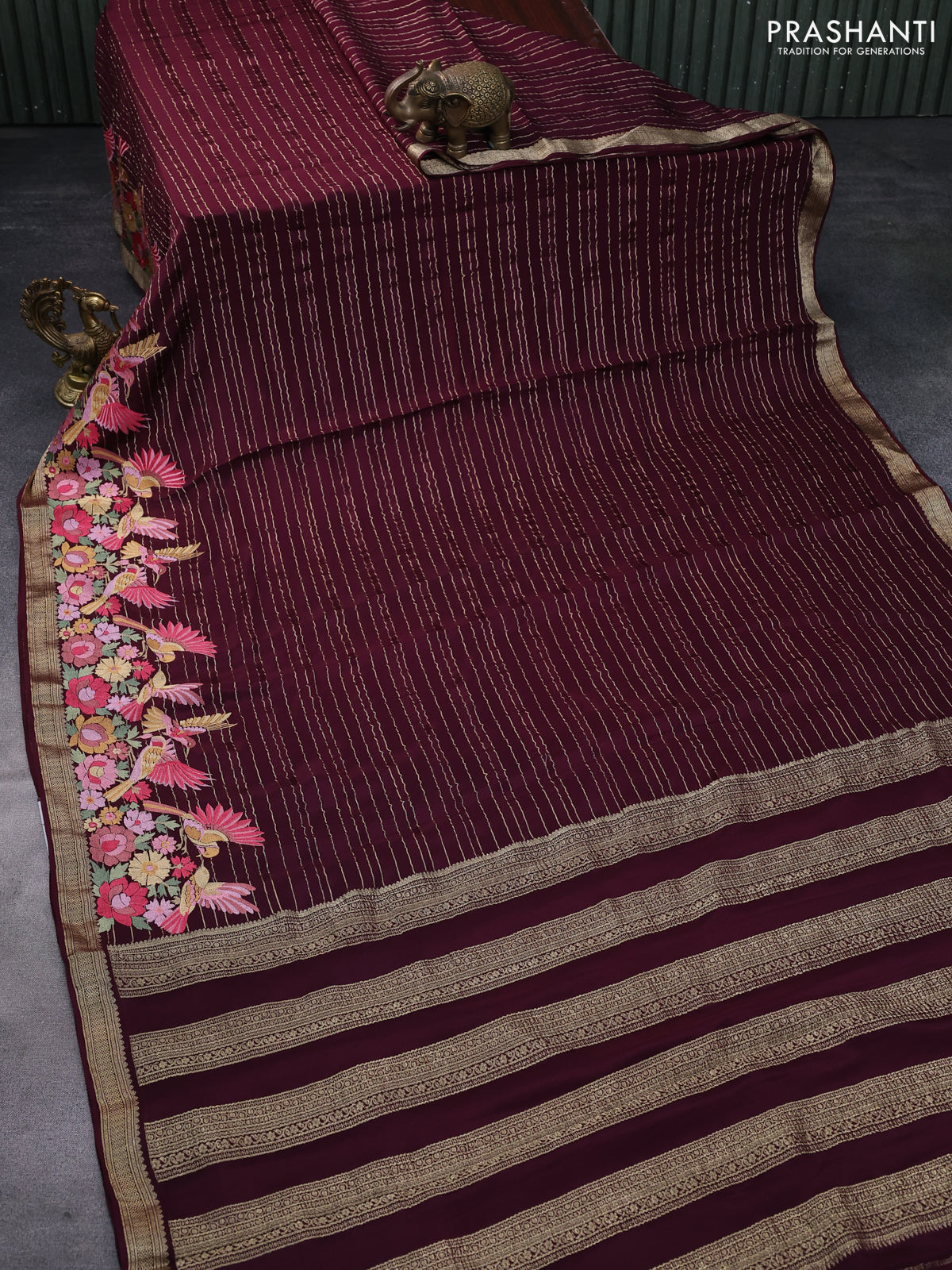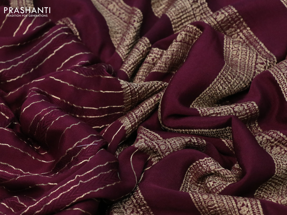 Pure crepe saree maroon with allover zari weaves & embroidery work and zari woven border