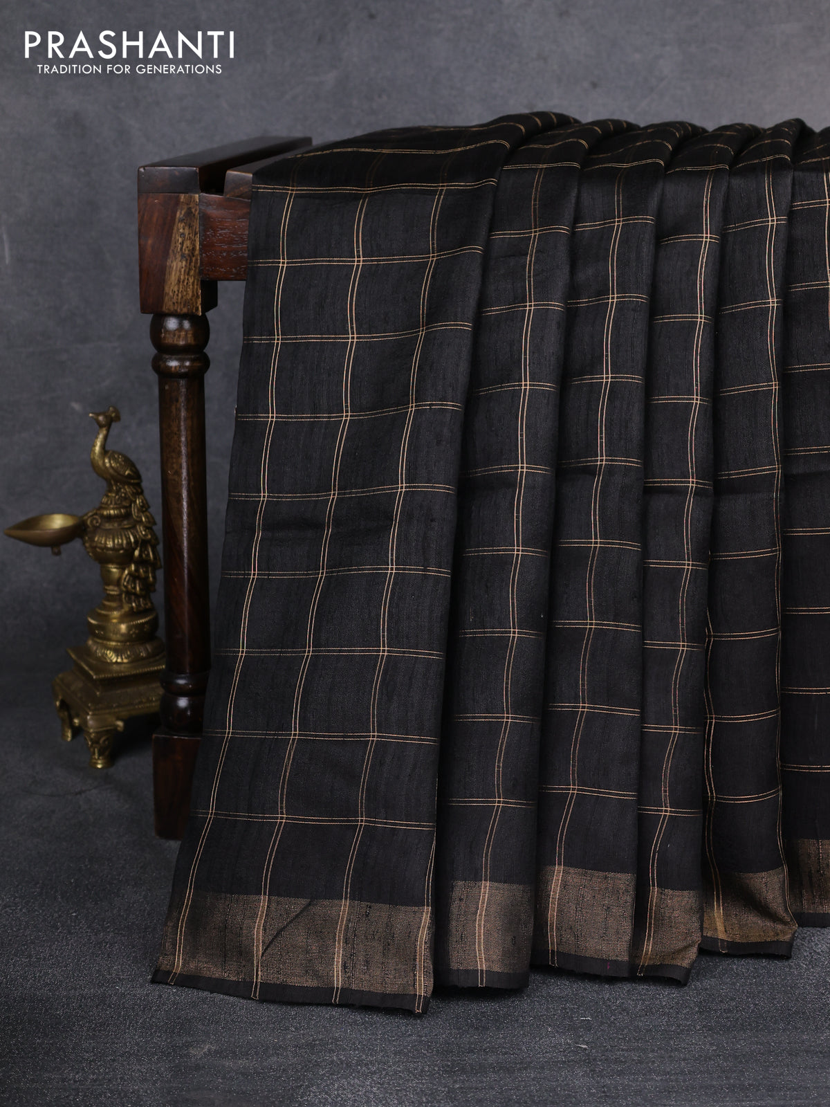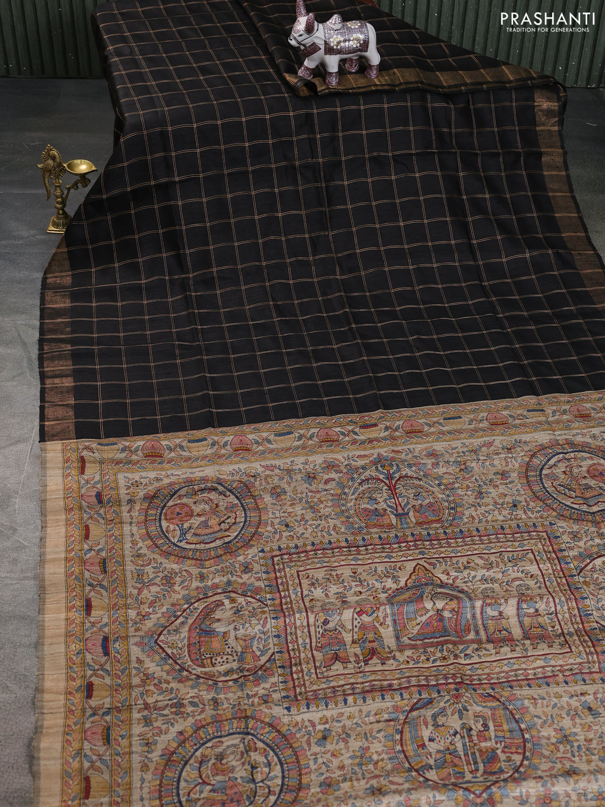 Pure dupion saree black and beige with allover zari checked pattern and madhubani printed pallu & blouse
