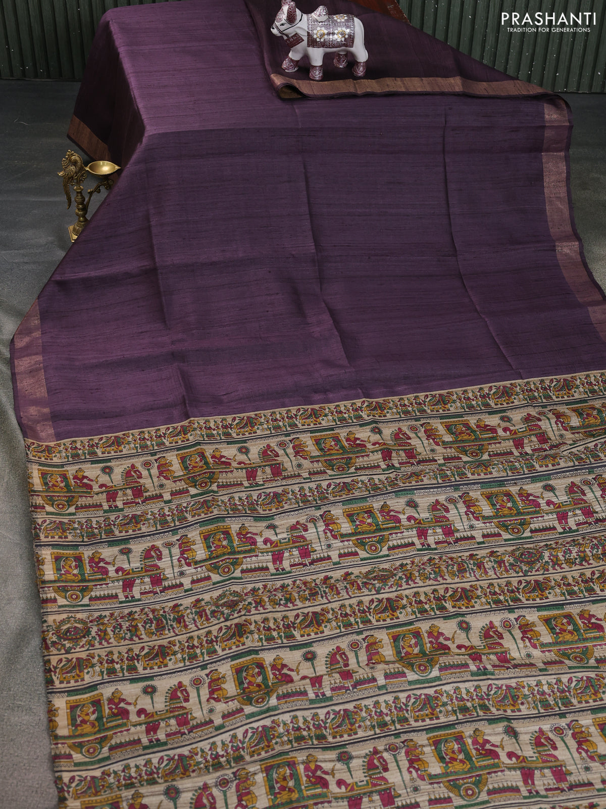 Pure dupion saree deep jamun and beige with plain body and kalamkari printed pallu & blouse