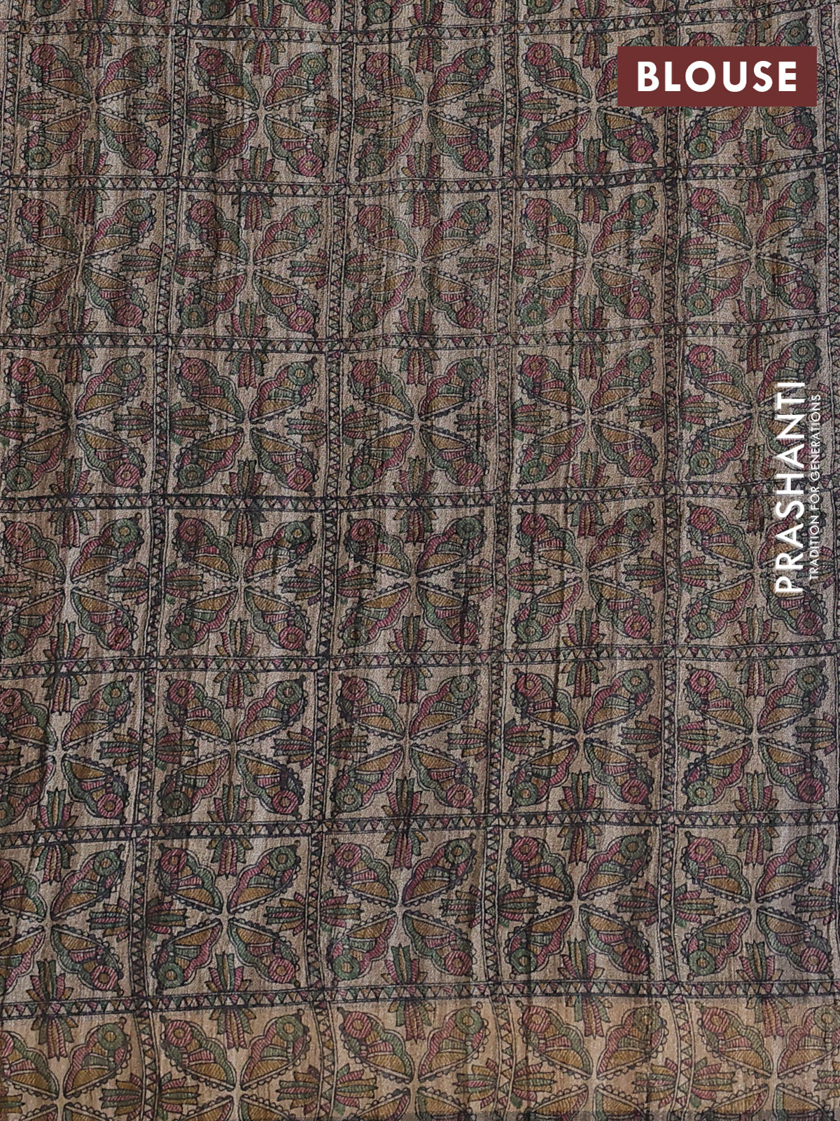 Pure dupion saree deep jamun and beige with plain body and madhubani printed pallu & blouse