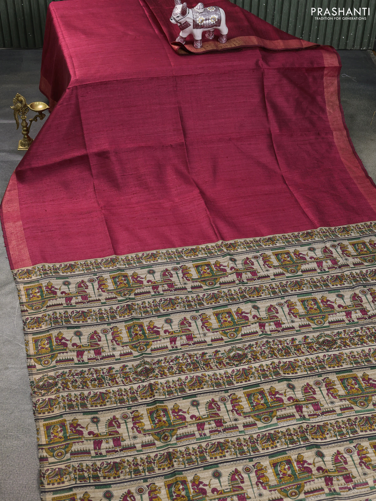 Pure dupion saree maroon and beige with plain body and kalamkari printed pallu & blouse