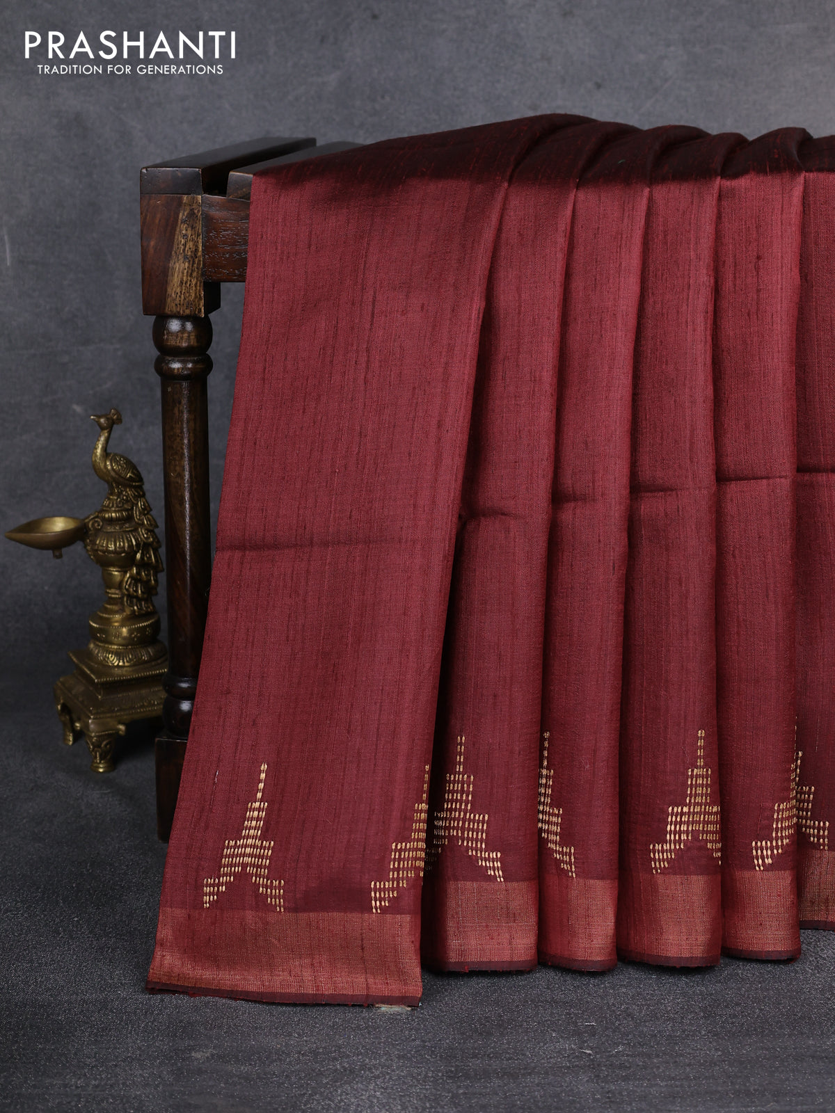 Pure dupion saree maroon and beige with plain body and madhubani printed pallu & blouse