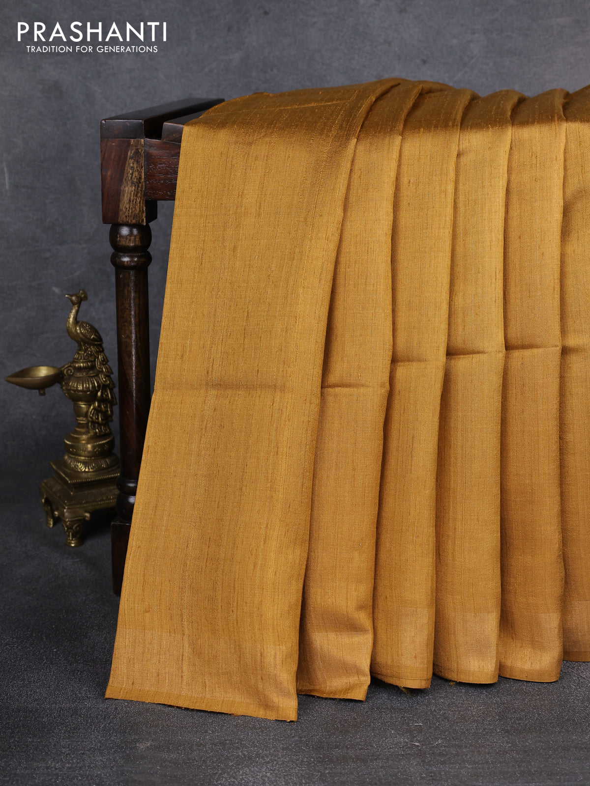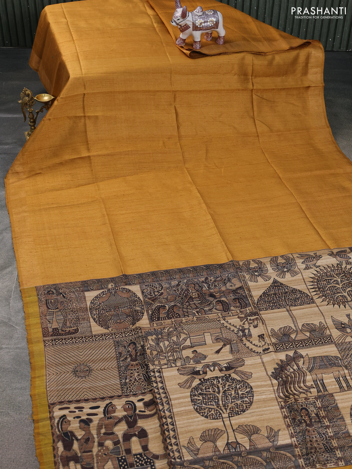 Pure dupion saree mustard yellow and beige with plain body and madhubani printed pallu & blouse