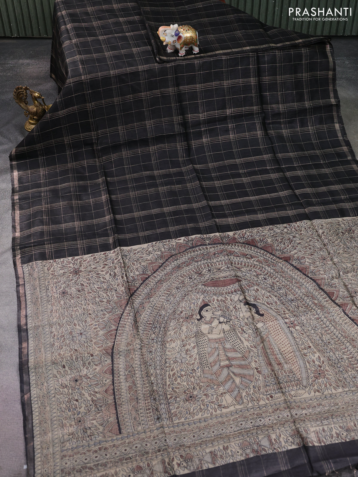 Pure dupion silk saree black and beige with allover zari checked pattern and madhubani printed pallu & blouse