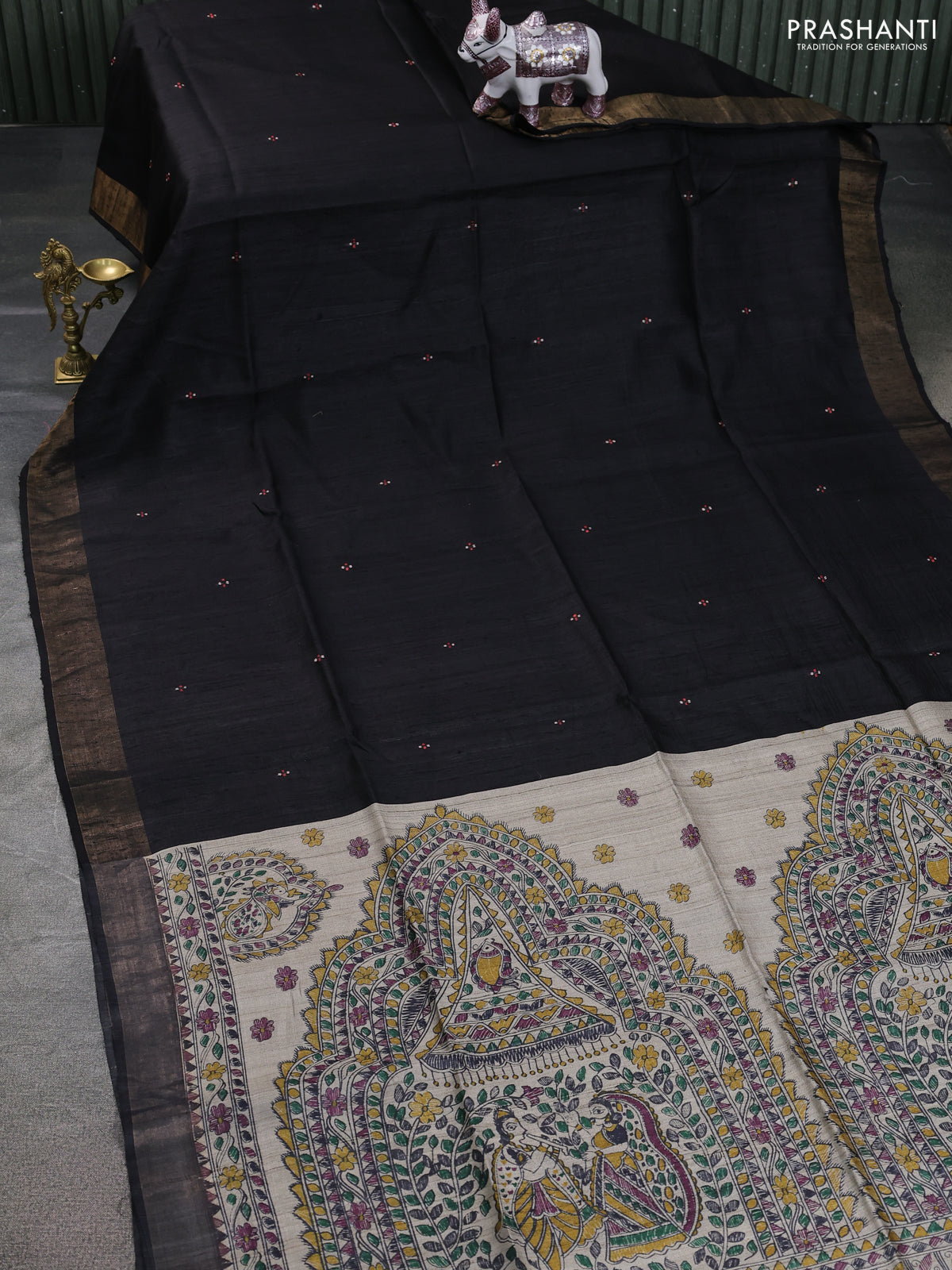 Pure dupion silk saree black and beige with thread woven buttas and madhubani printed pallu & blouse