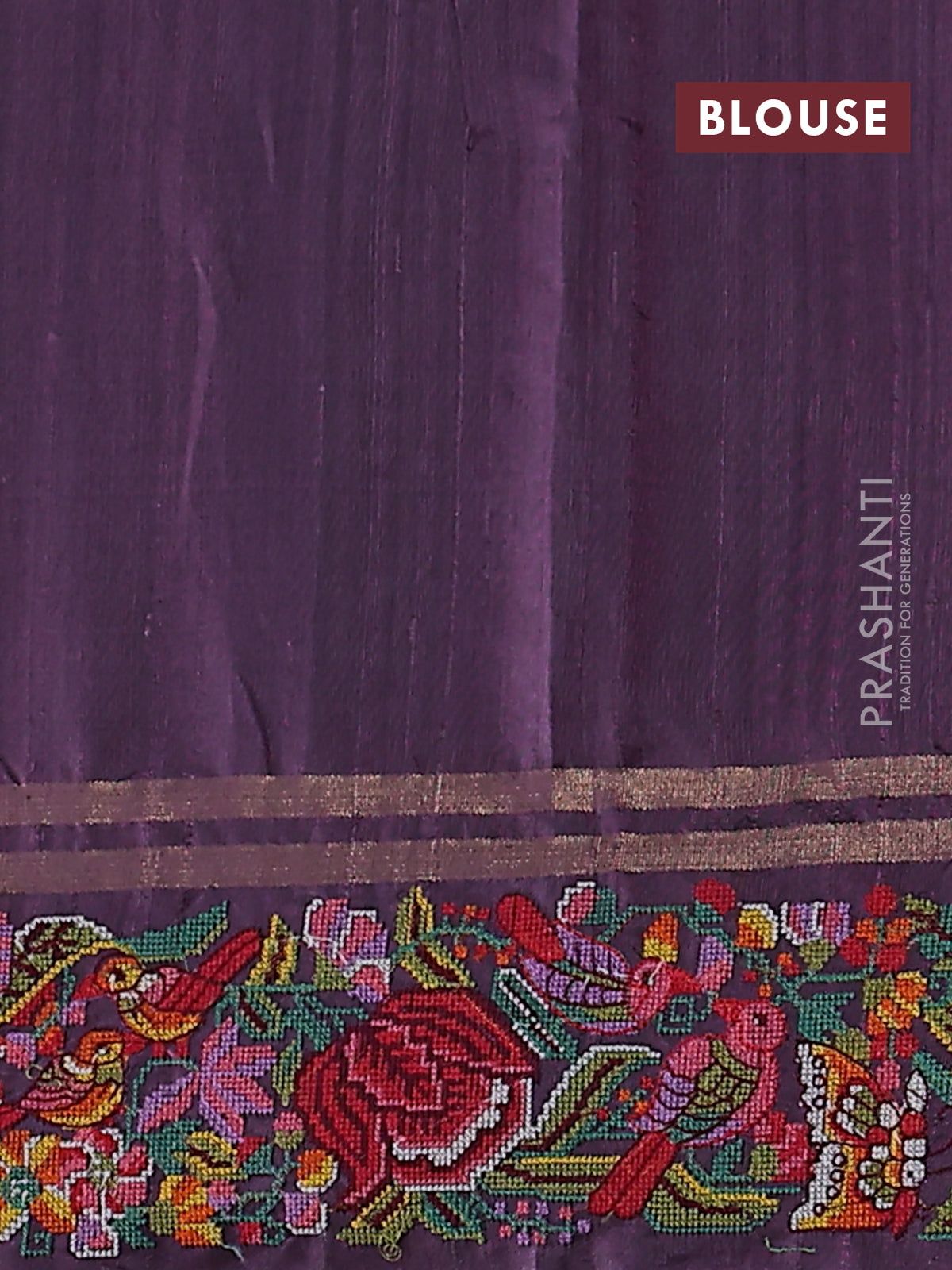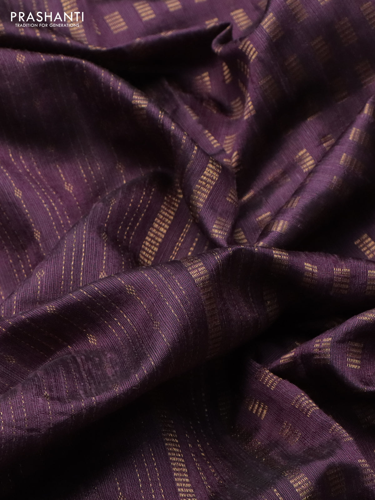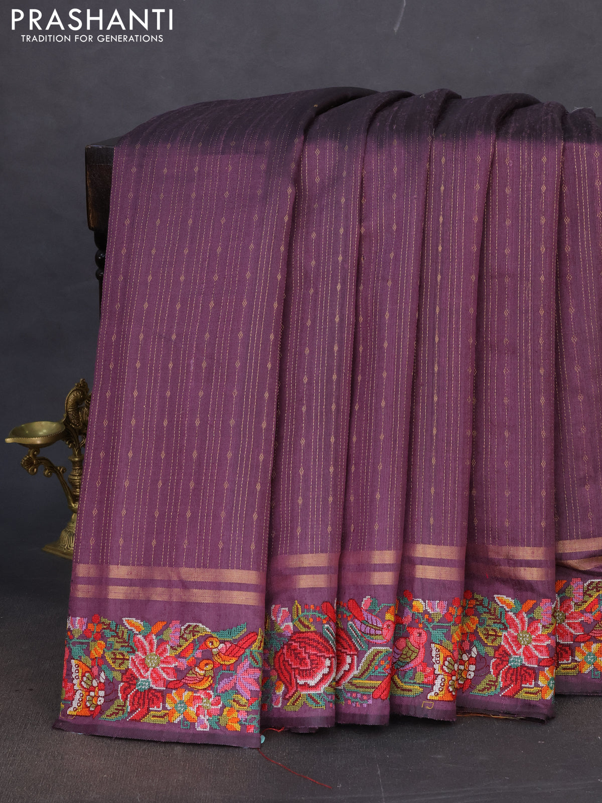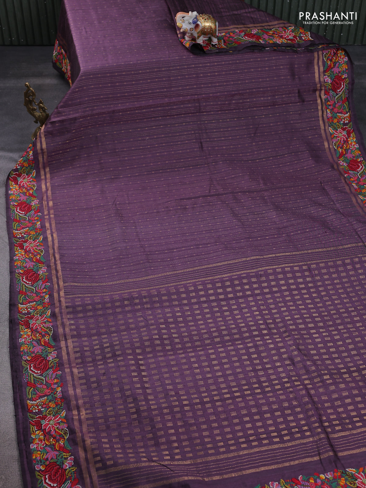 Pure dupion silk saree deep jamun with allover zari weaves and floral embroidery border