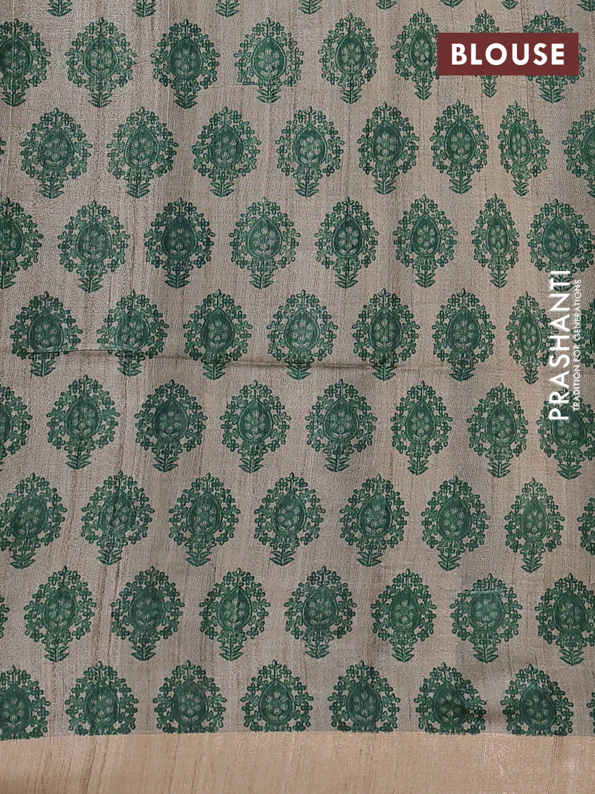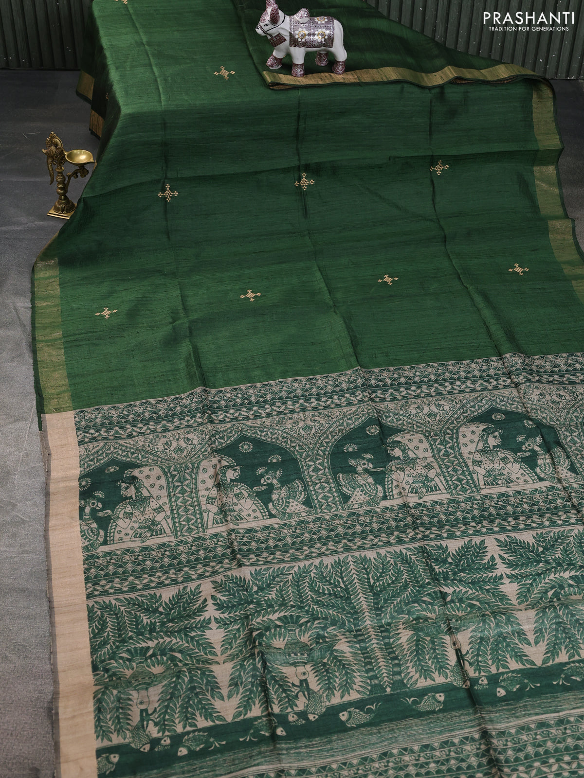 Pure dupion silk saree green and beige with plain body and madhubani printed pallu & blouse