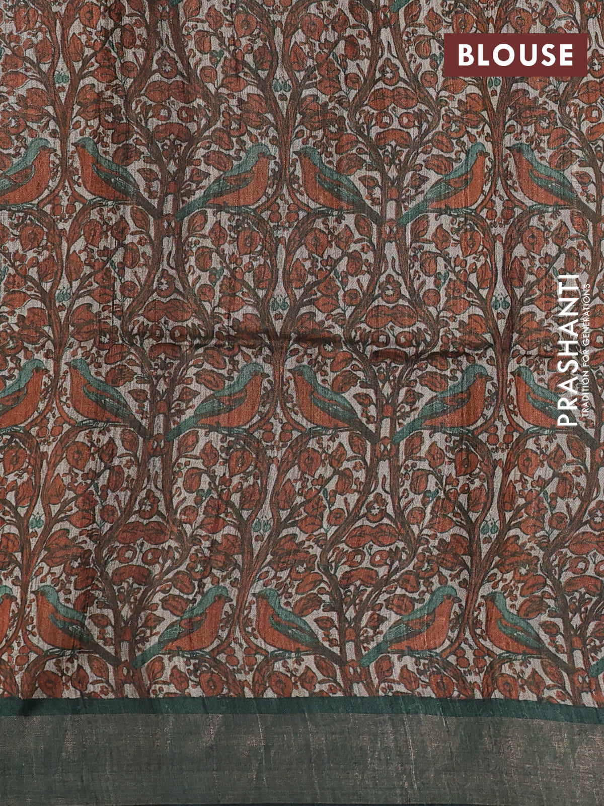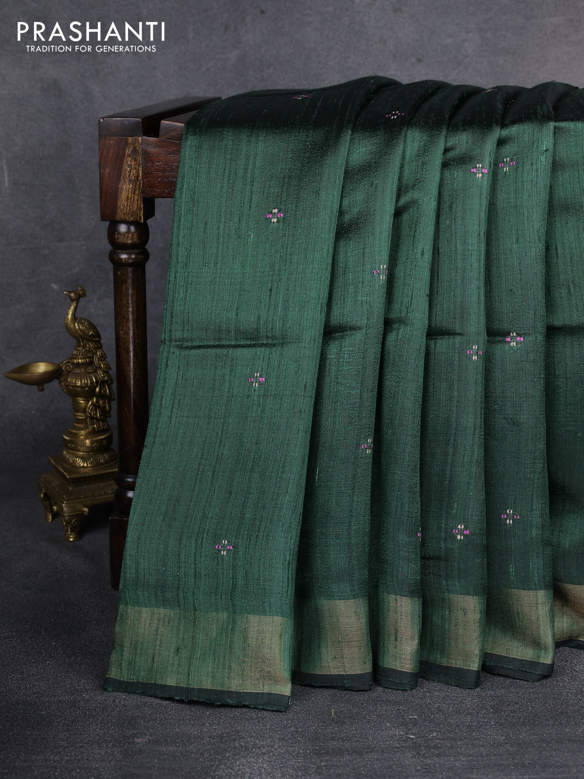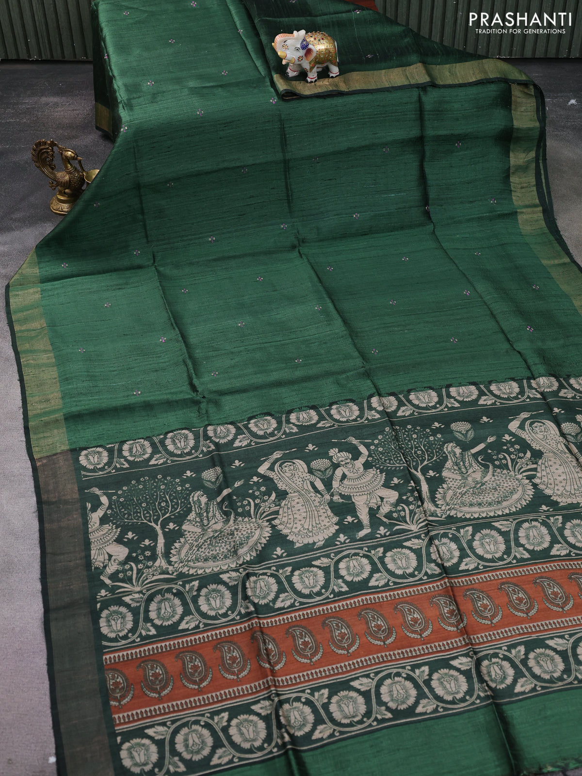Pure dupion silk saree green with thread woven buttas and kalamkari printed pallu & blouse