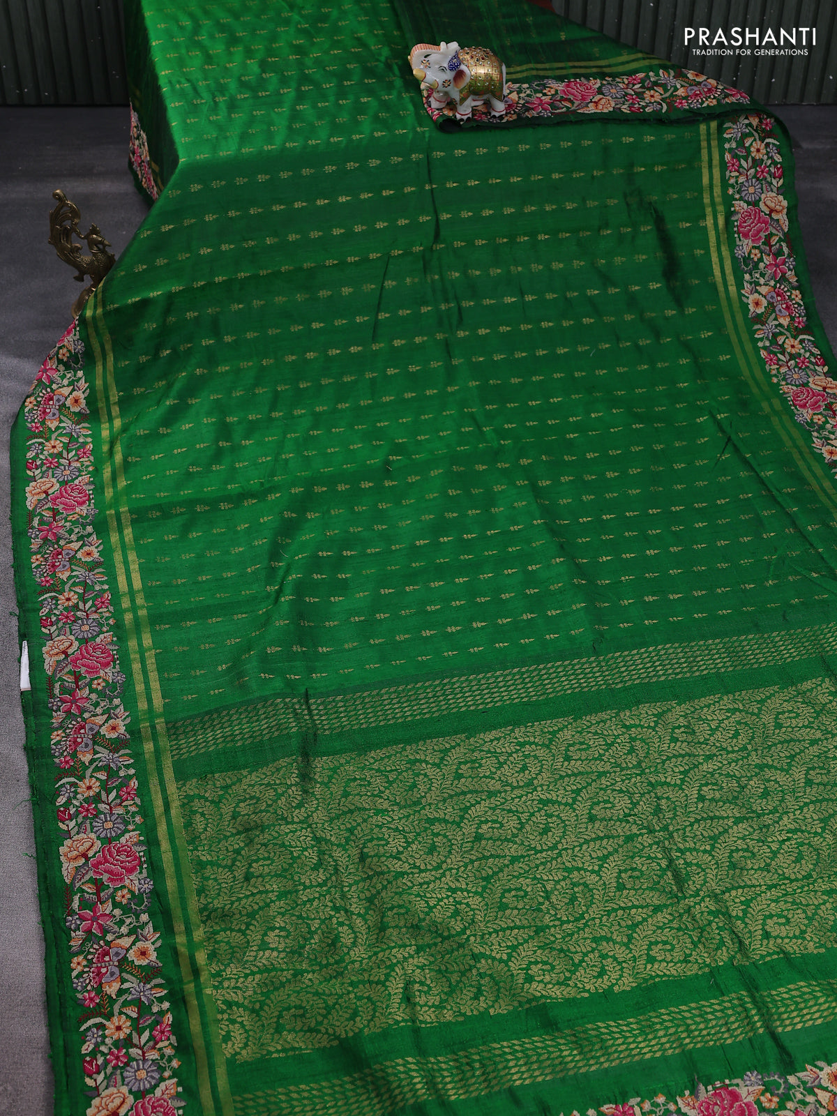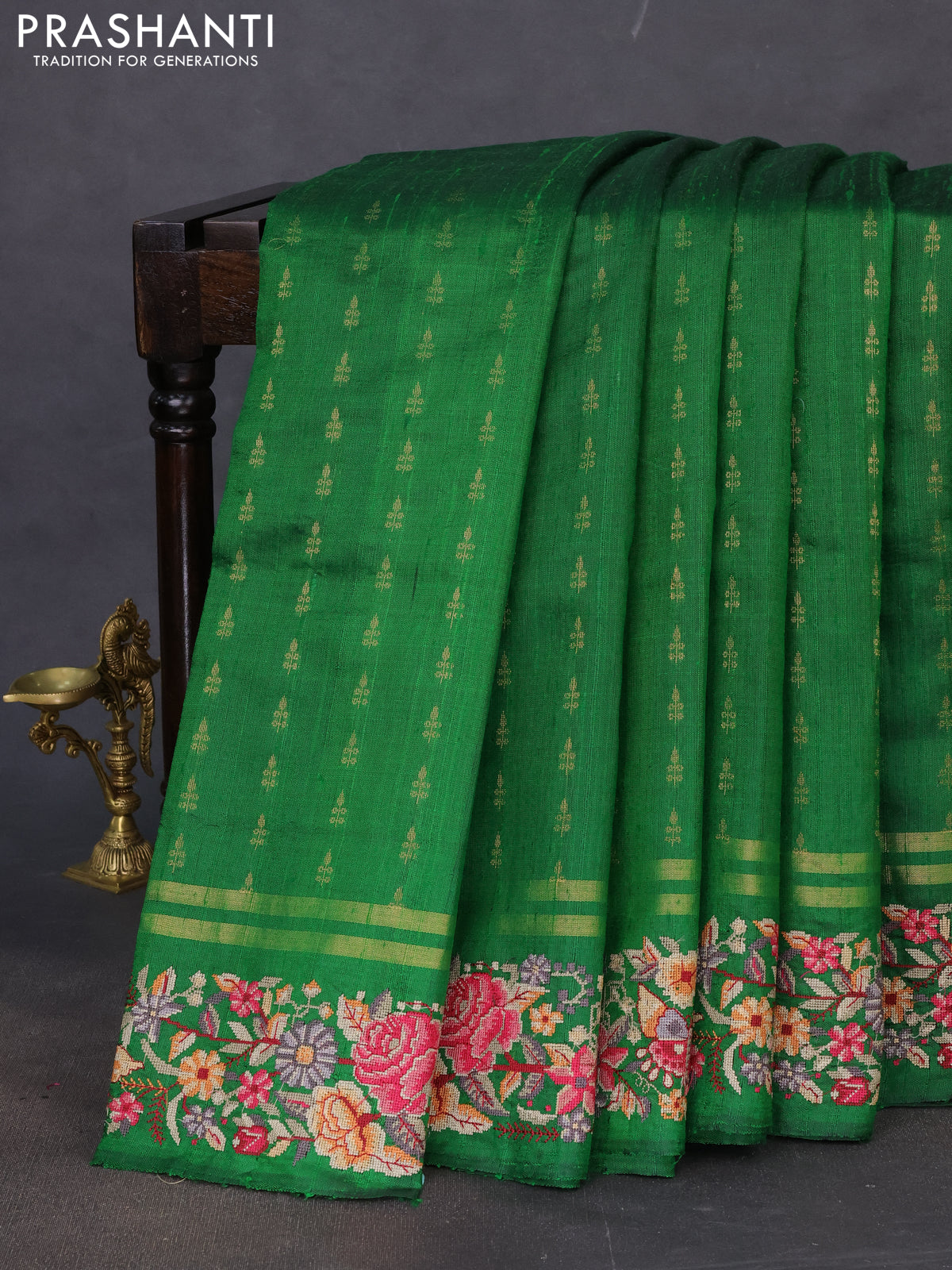 Pure dupion silk saree green with zari woven buttas and floral embroidery border