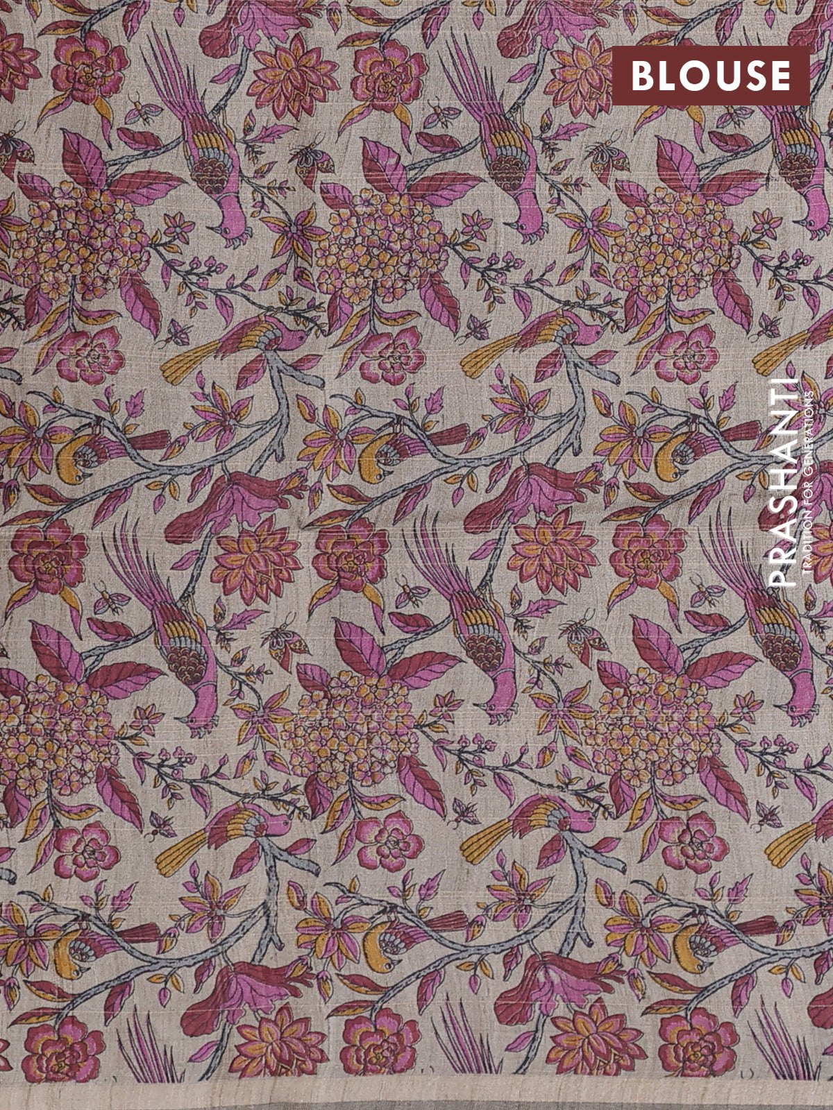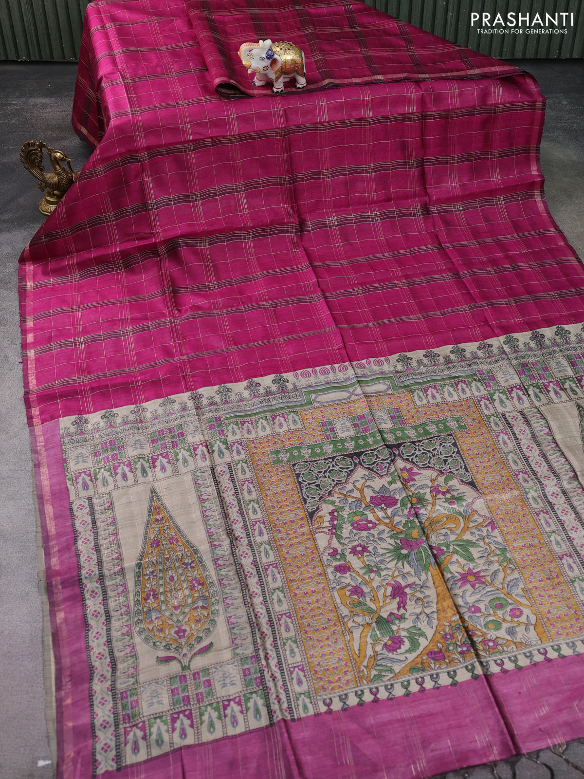 Pure dupion silk saree magenta pink and beige with allover zari checked pattern and madhubani printed pallu & blouse