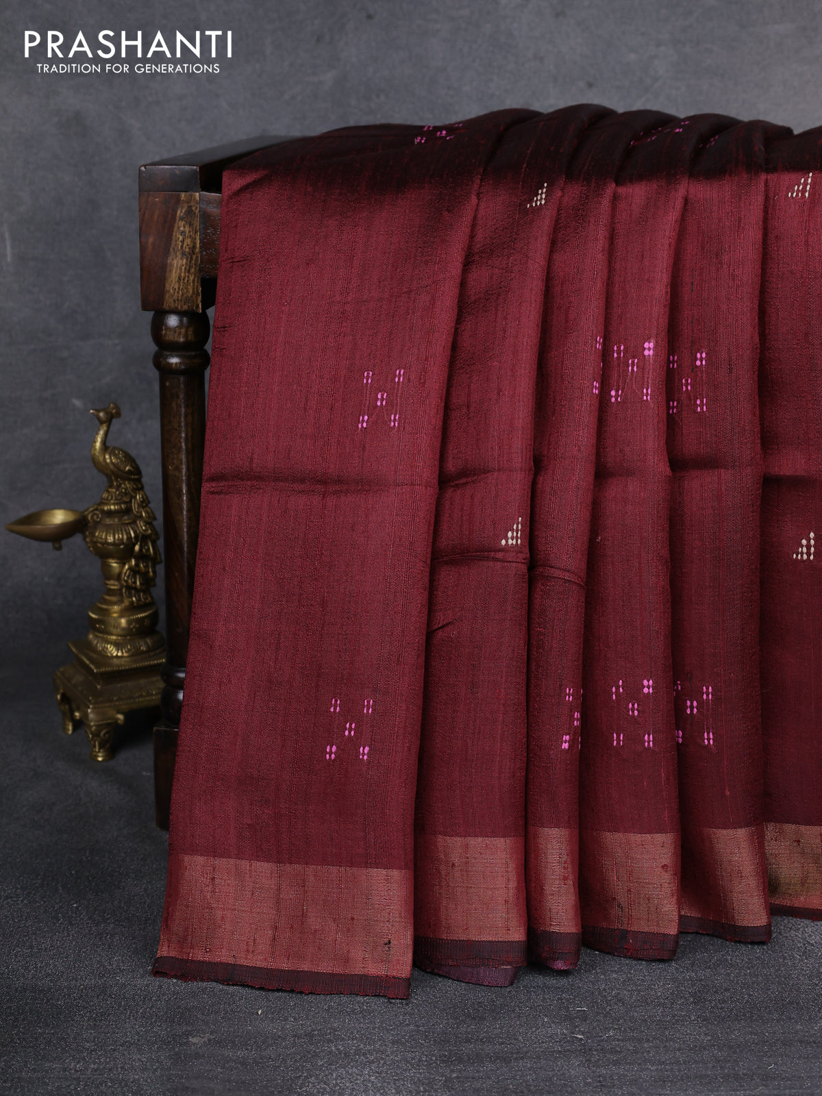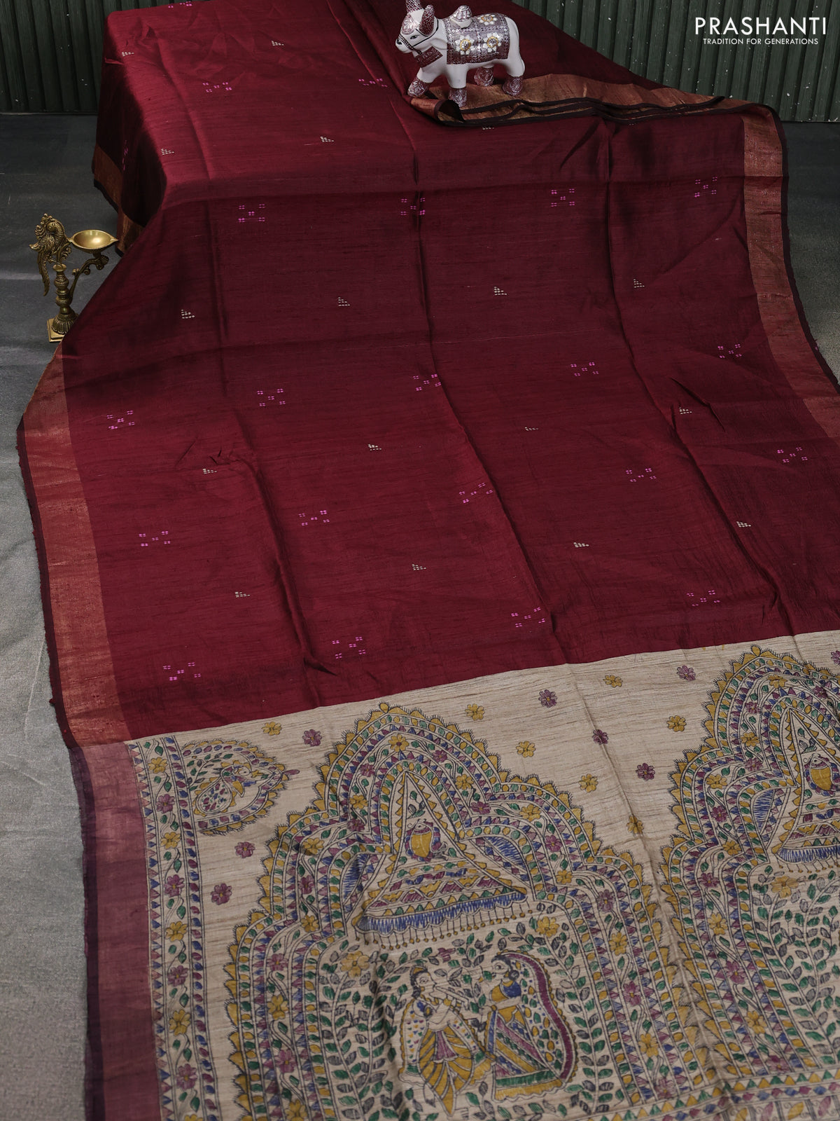 Pure dupion silk saree maroon and beige with thread woven buttas and madhubani printed pallu & blouse