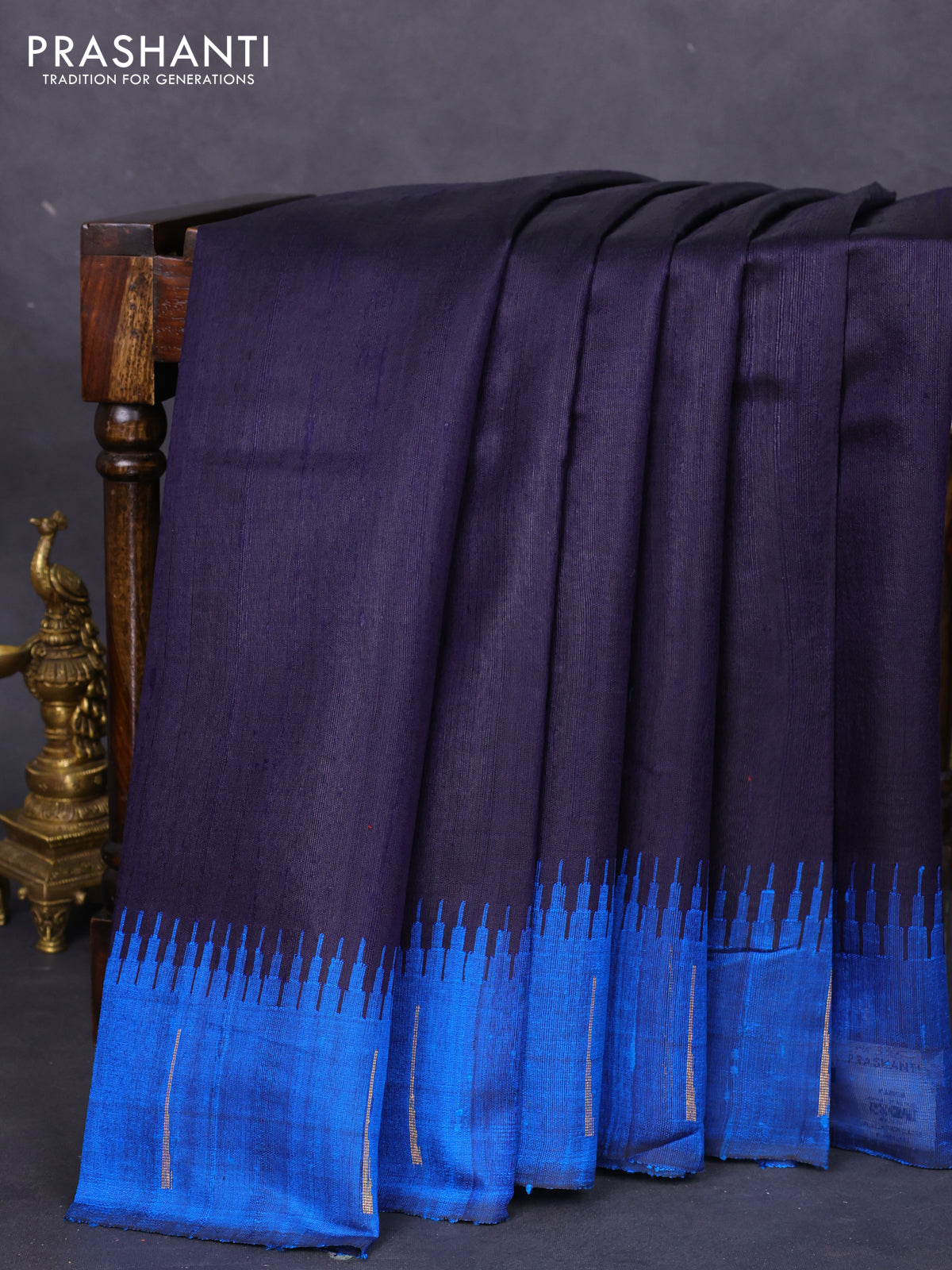 Pure dupion silk saree navy blue and cs blue with plain body and temple design simple border