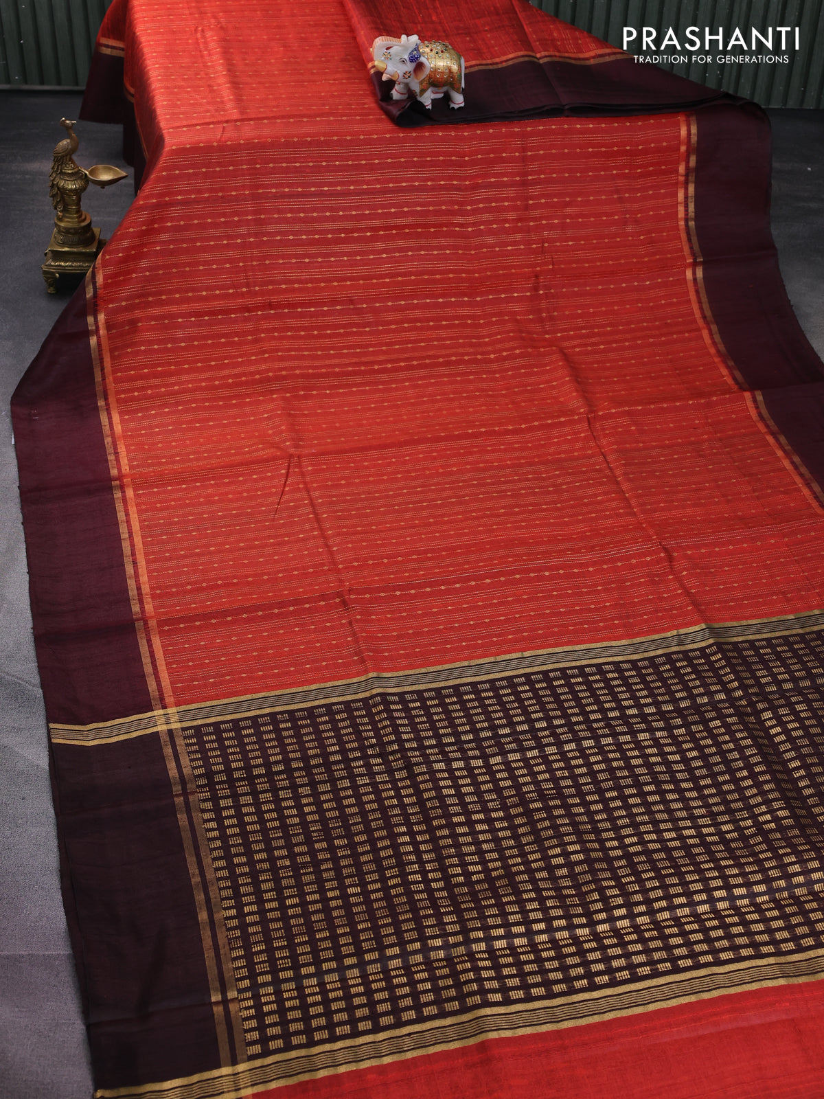 Pure dupion silk saree orange and deep maroon with allover zari weaves and zari woven simple border