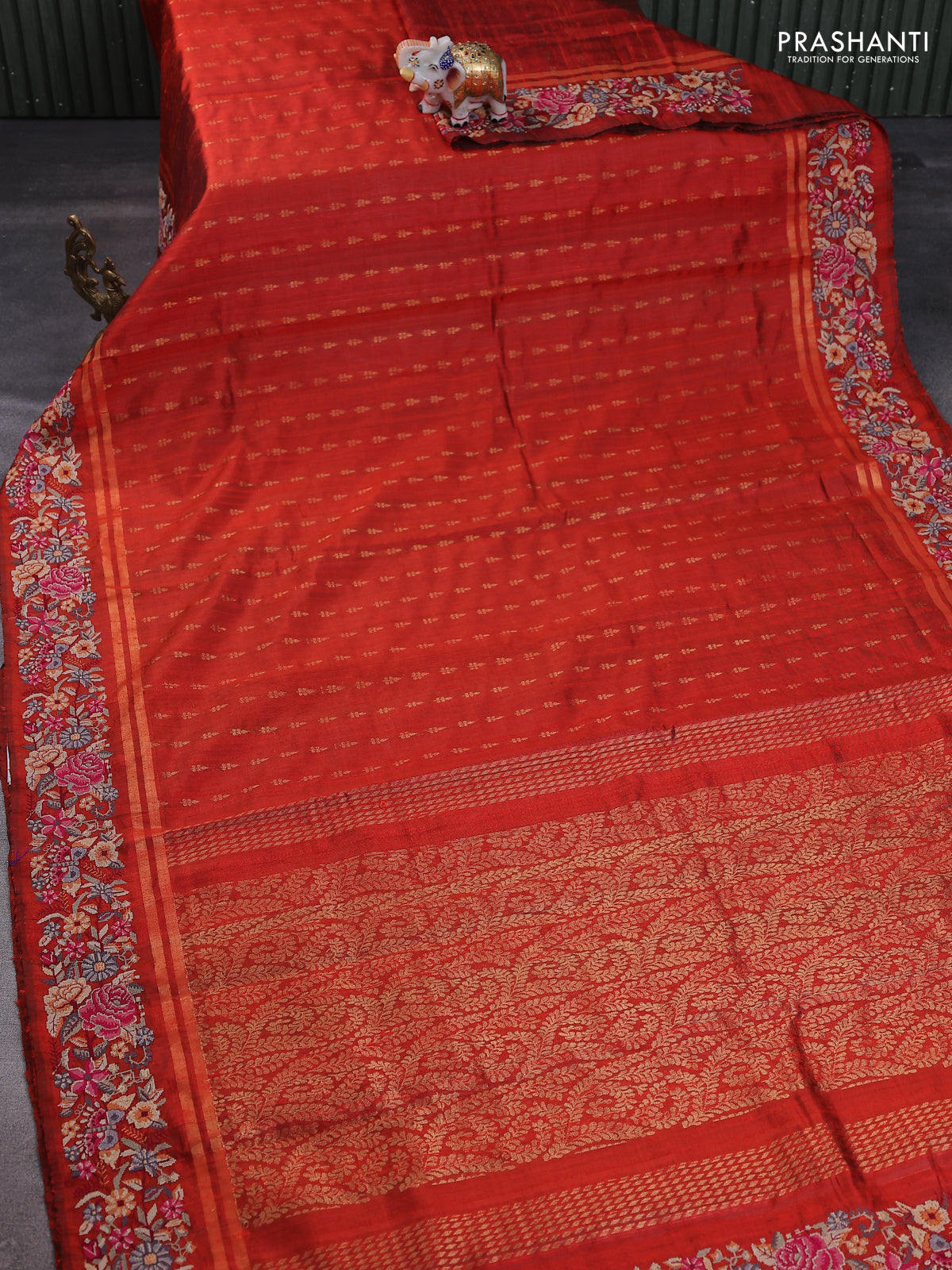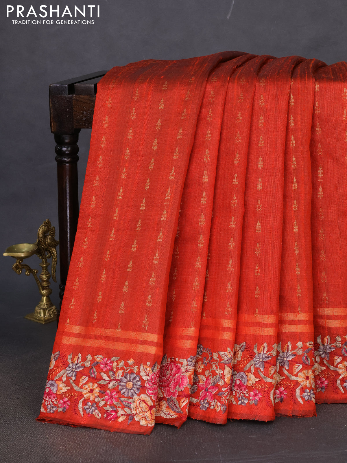 Pure dupion silk saree orange with zari woven buttas and floral embroidery border