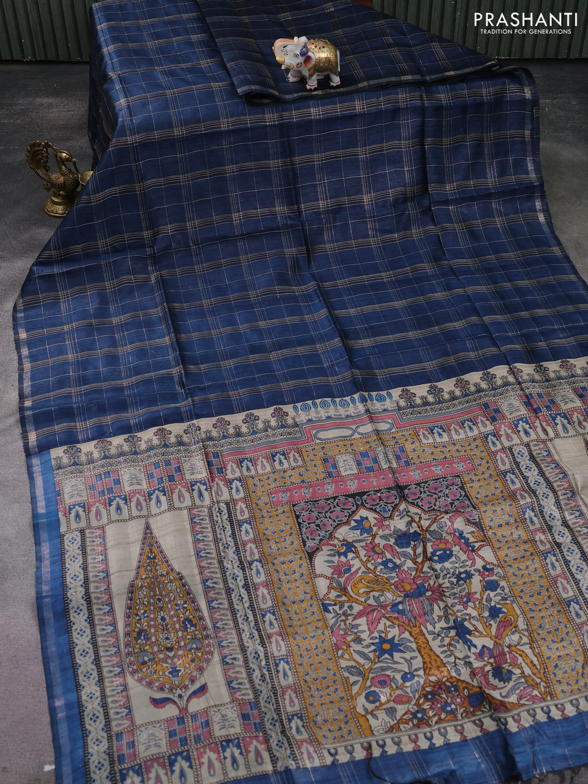 Pure dupion silk saree peacock blue and beige with allover zari checked pattern and madhubani printed pallu & blouse