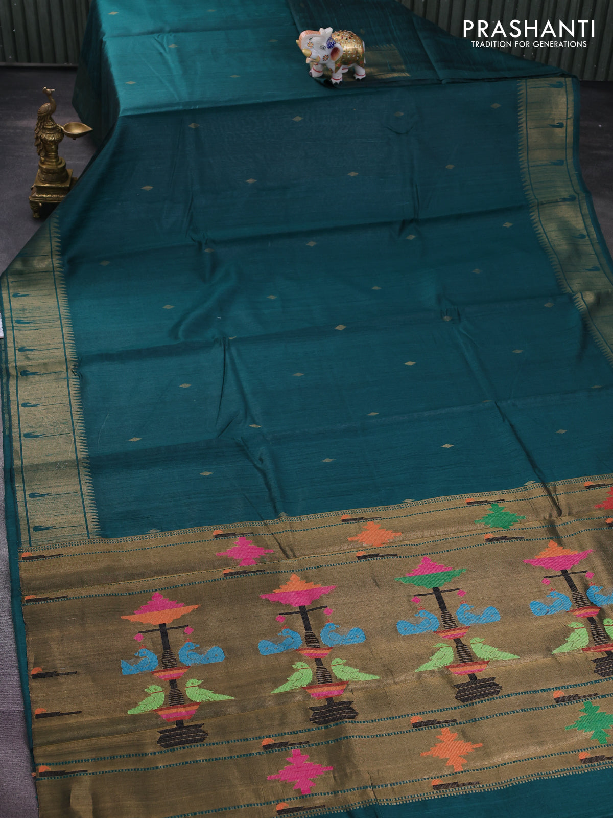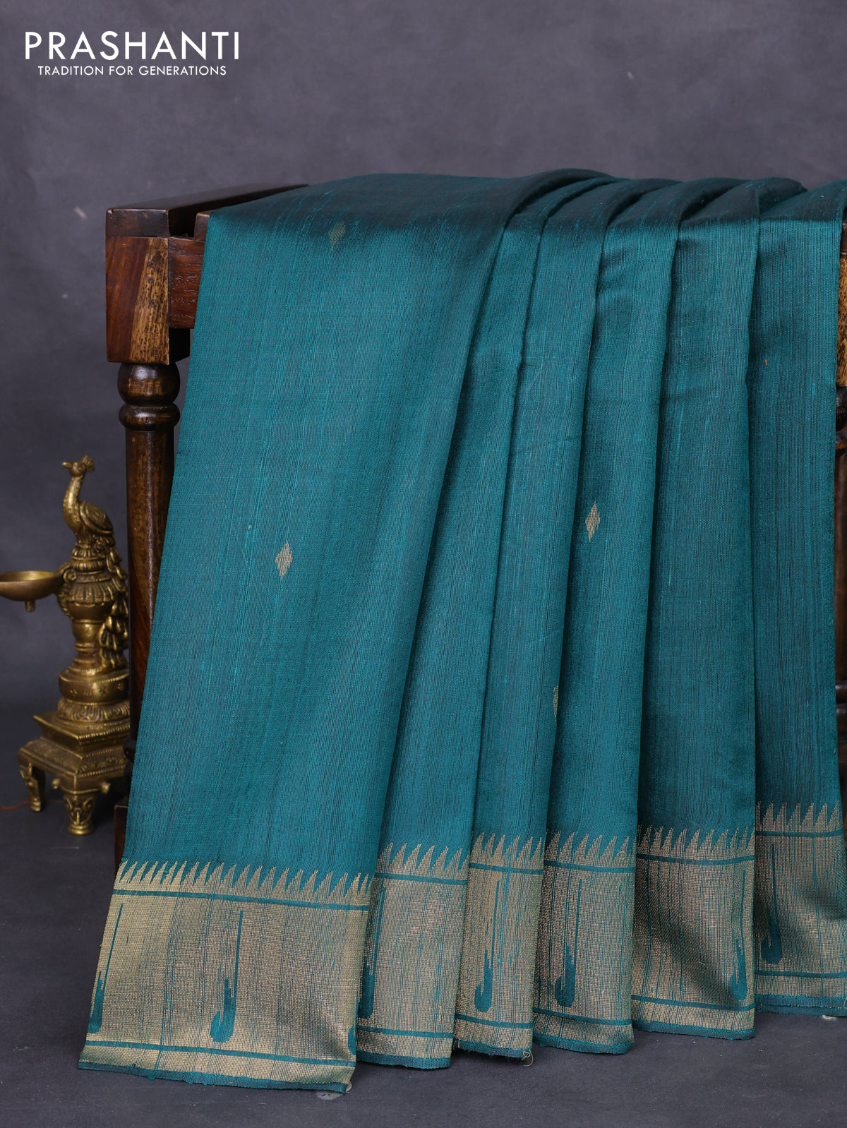 Pure dupion silk saree peacock green with zari woven buttas and zari woven border