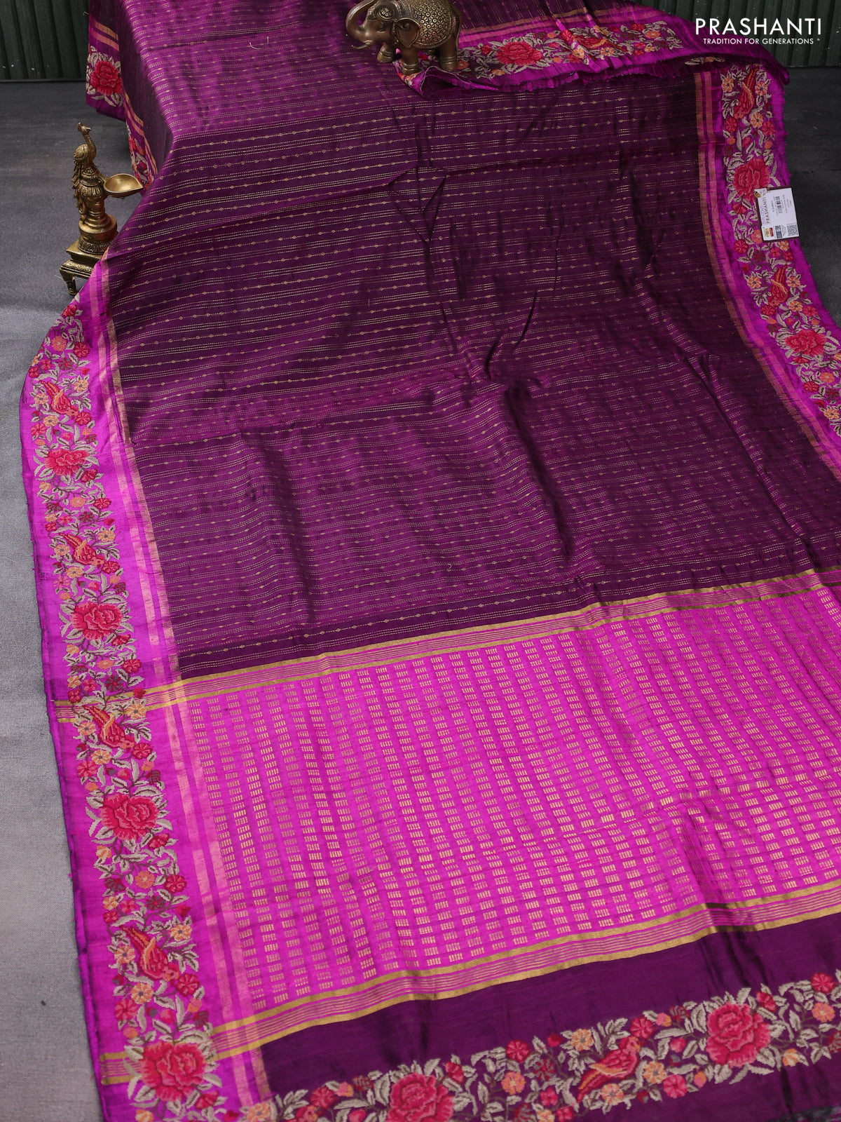 Pure dupion silk saree purple and magenta pink with allover zari weaves and parsi work border