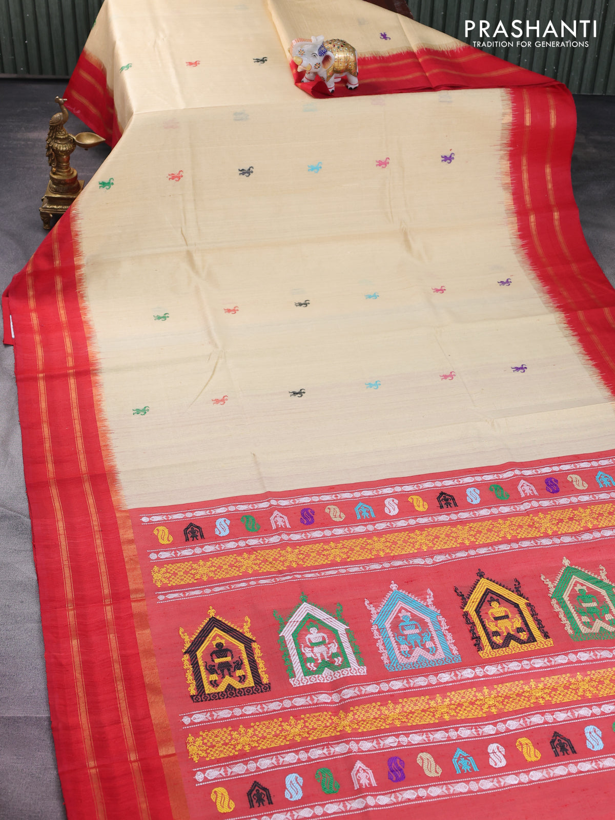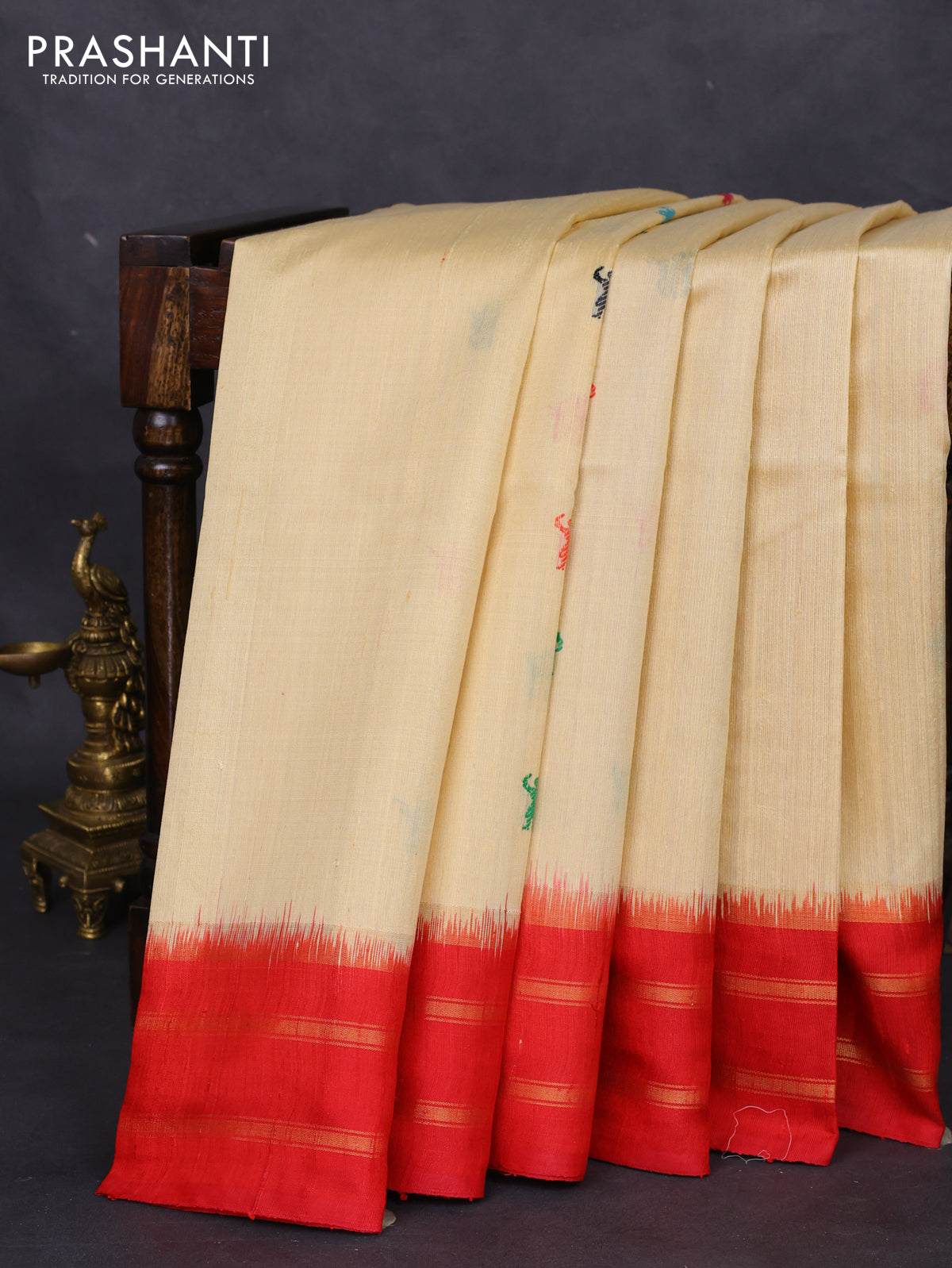 Pure dupion silk saree sandal and red with thread woven buttas and zari woven border