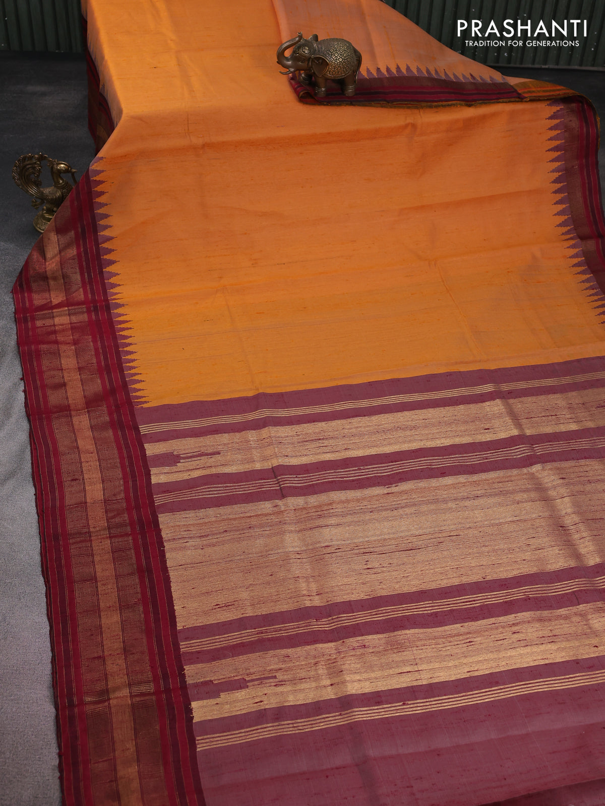 Pure dupion silk saree yellow and maroon with plain body and temple design zari woven border