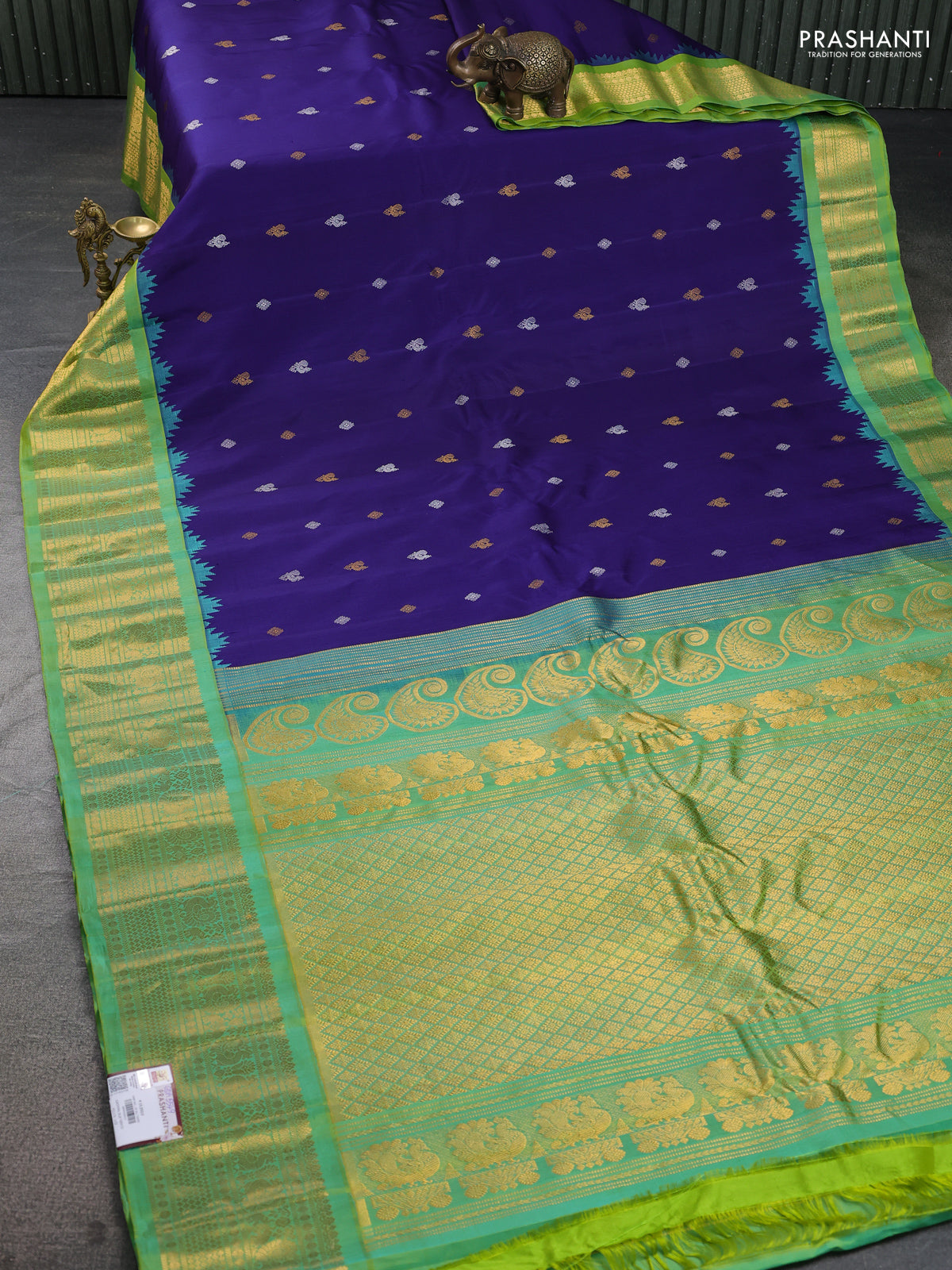 Pure gadwal silk saree blue and dual shade of green with silver & gold zari woven buttas and temple design zari woven border