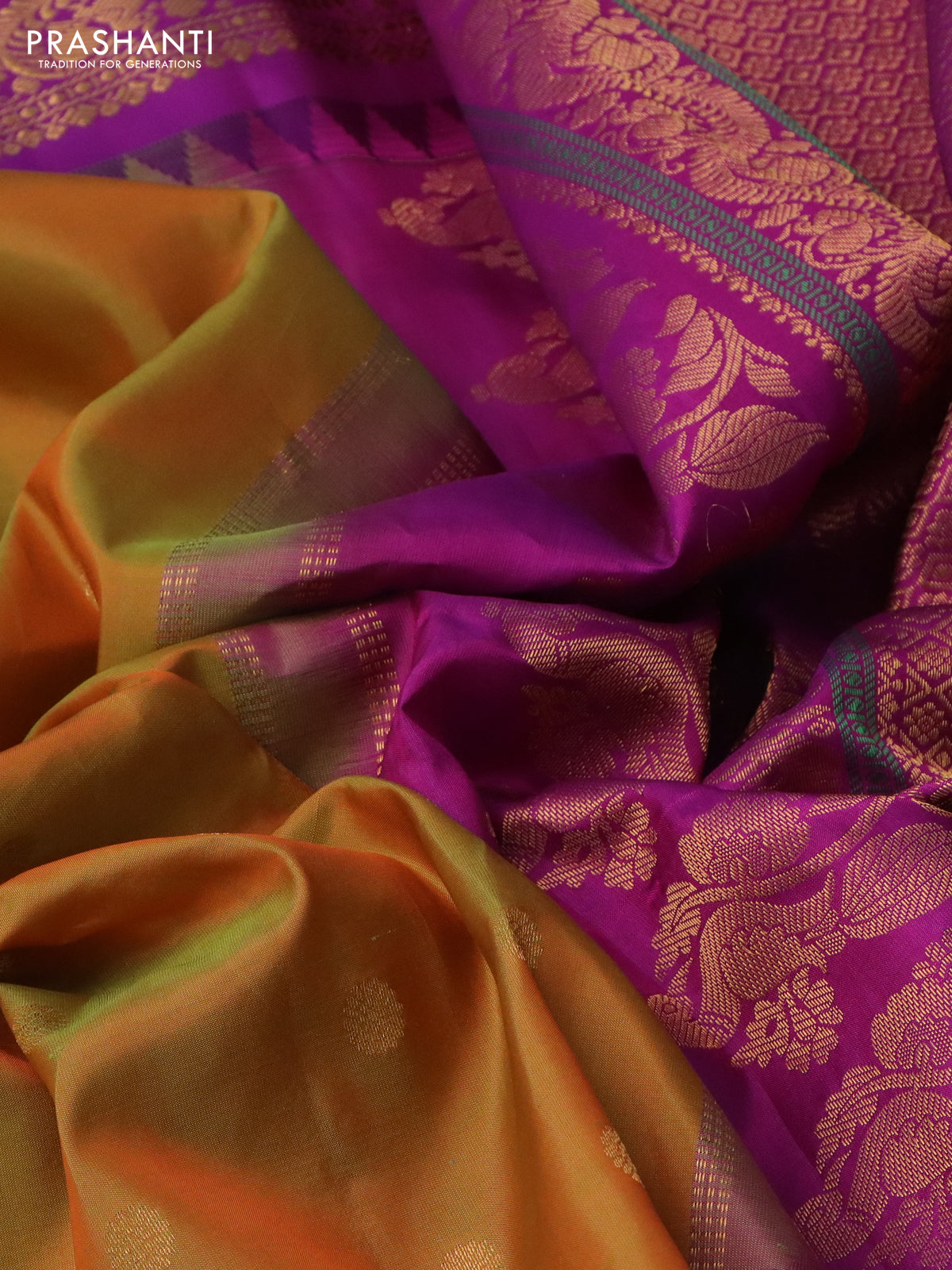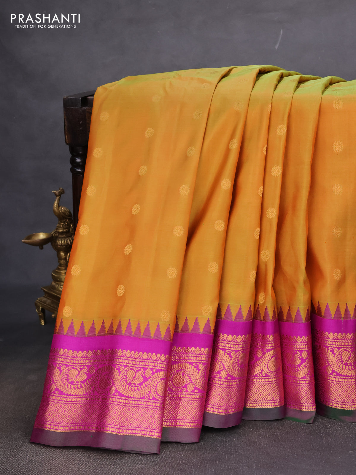 Pure gadwal silk saree dual shade of mustard and purple with floral zari woven buttas and temple design zari woven border