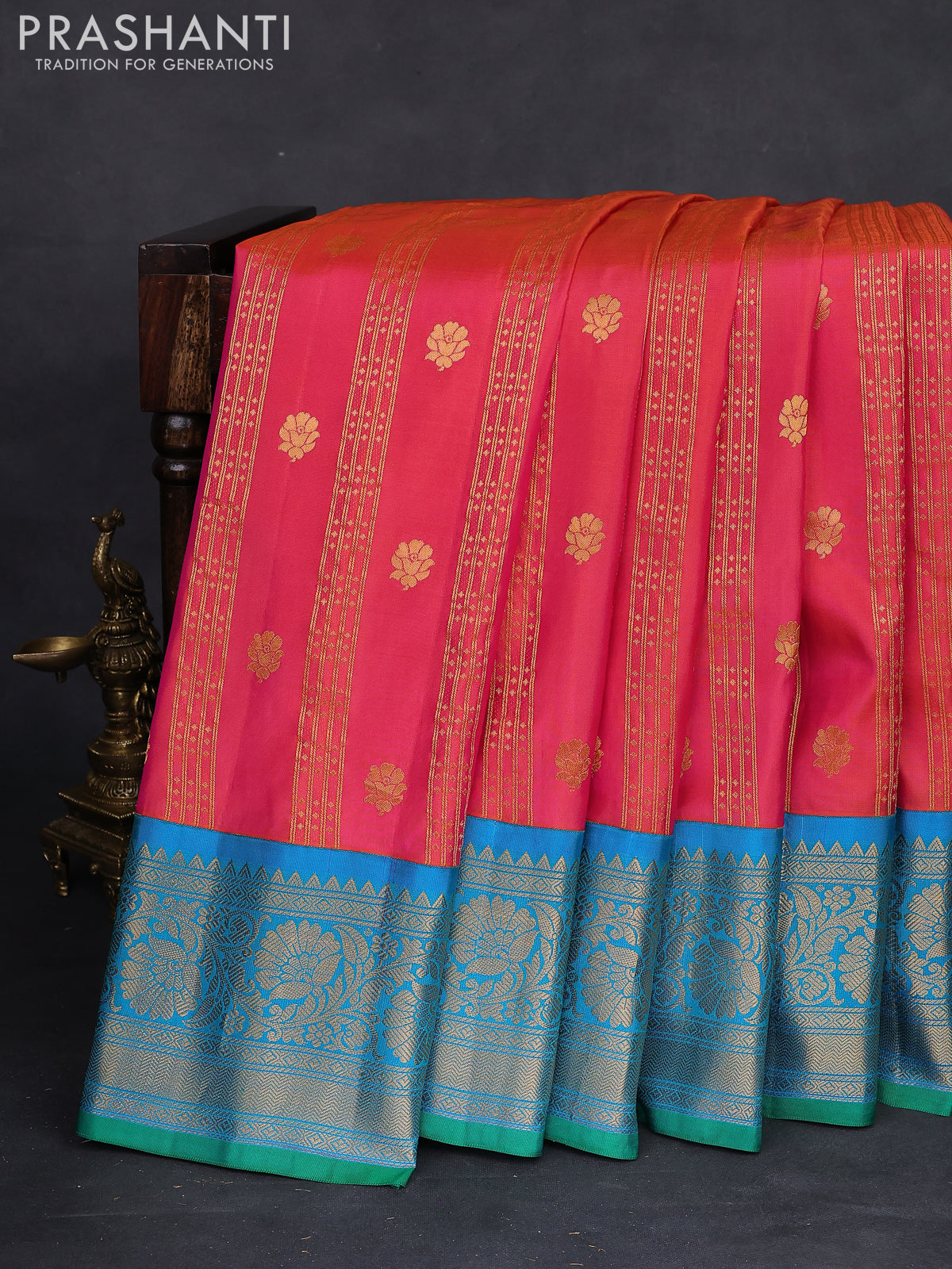 Pure gadwal silk saree dual shade of pinkish orange and dual shade of teal blue with allover zari weaves & buttas and floral zari woven border