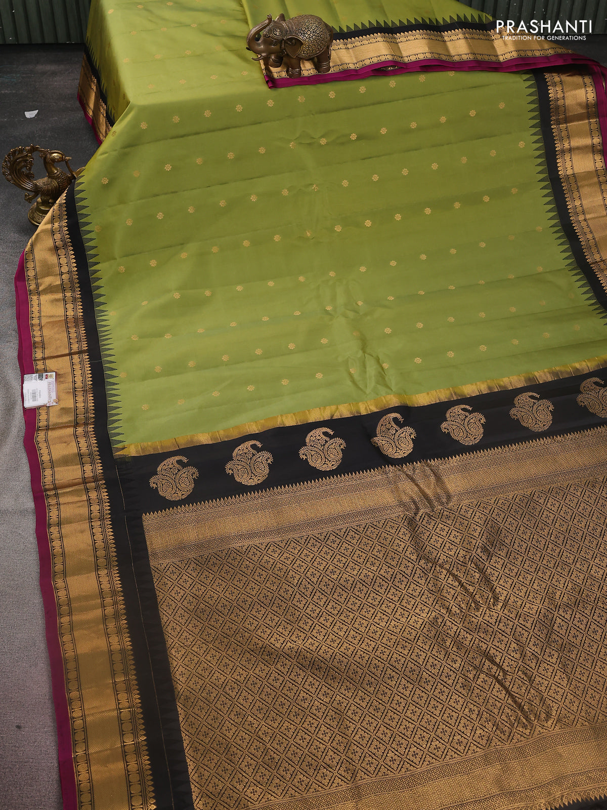 Pure gadwal silk saree light green and black with zari woven buttas and temple design zari woven border