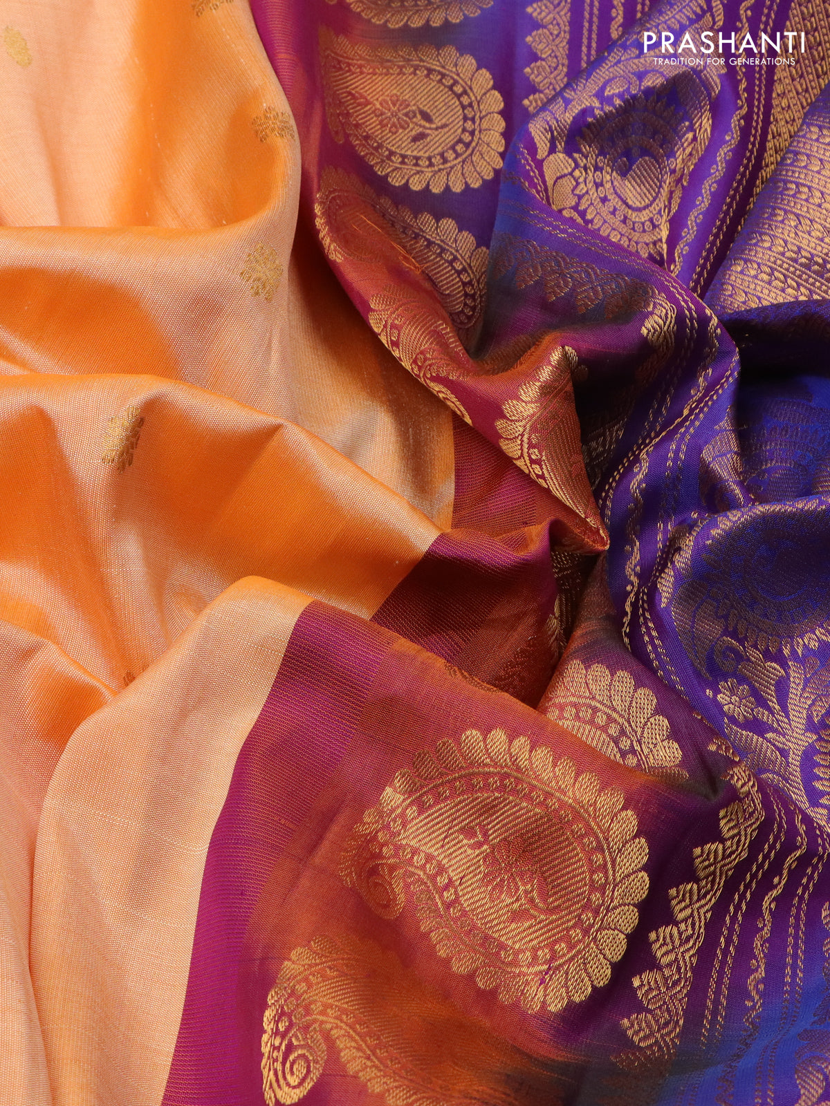 Pure gadwal silk saree pale orange and purple with zari woven buttas and temple design zari woven border