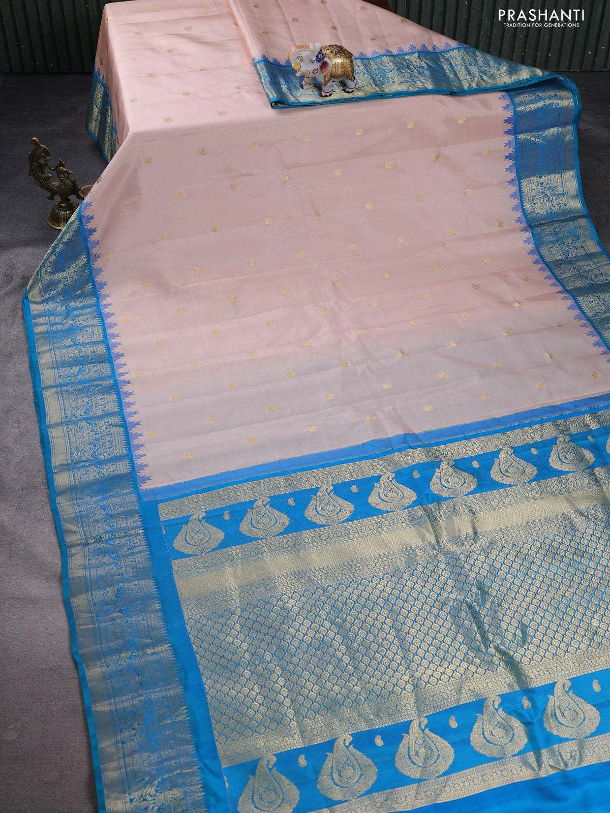 Pure gadwal silk saree pastel peach and dual shade of teal blue with annam zari woven buttas and temple design zari woven border