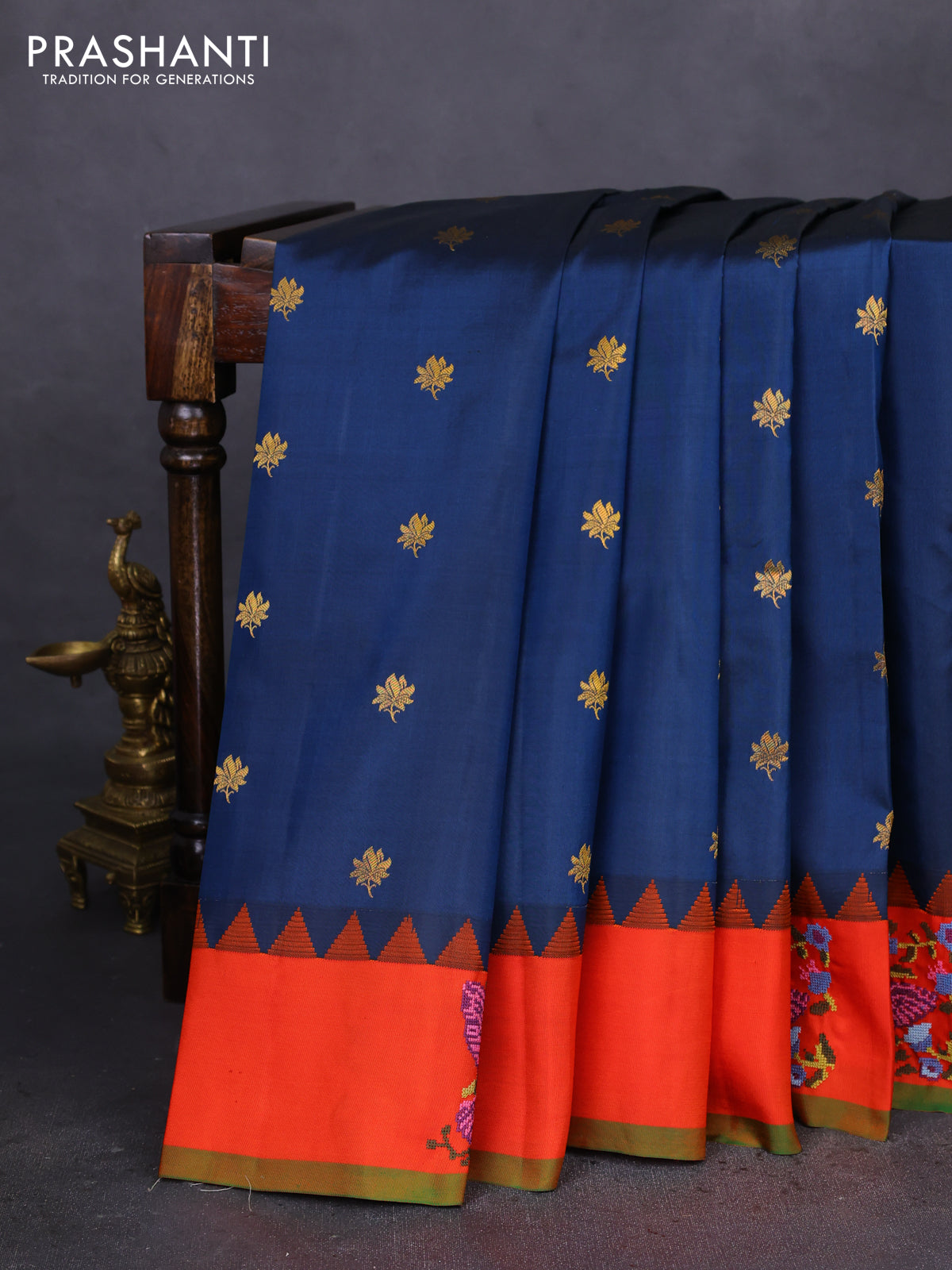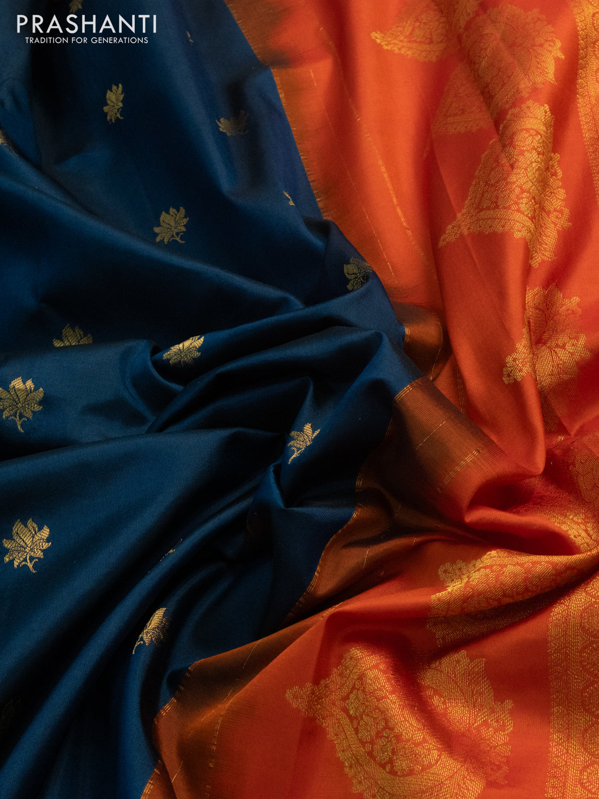 Pure gadwal silk saree peacock blue and orange with zari woven buttas and embroided butta border