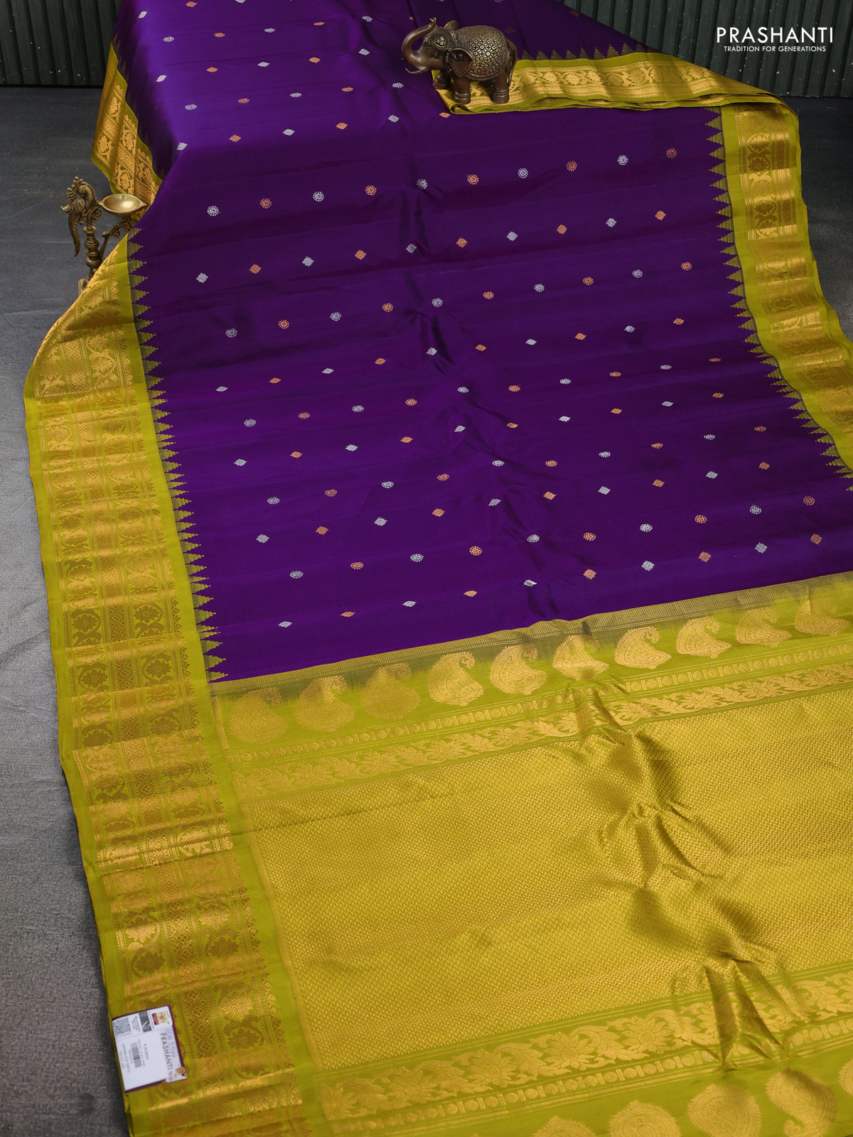 Pure gadwal silk saree purple and lime green with silver & gold zari woven buttas and temple design zari woven border