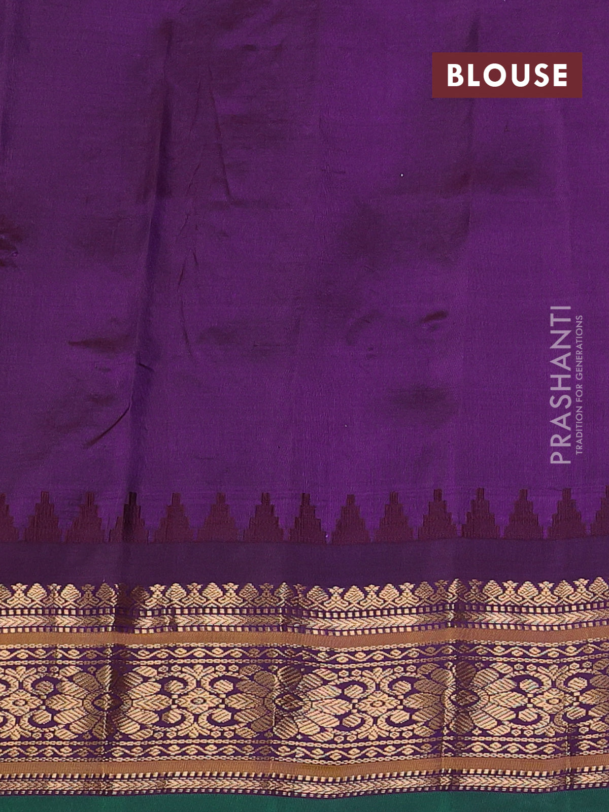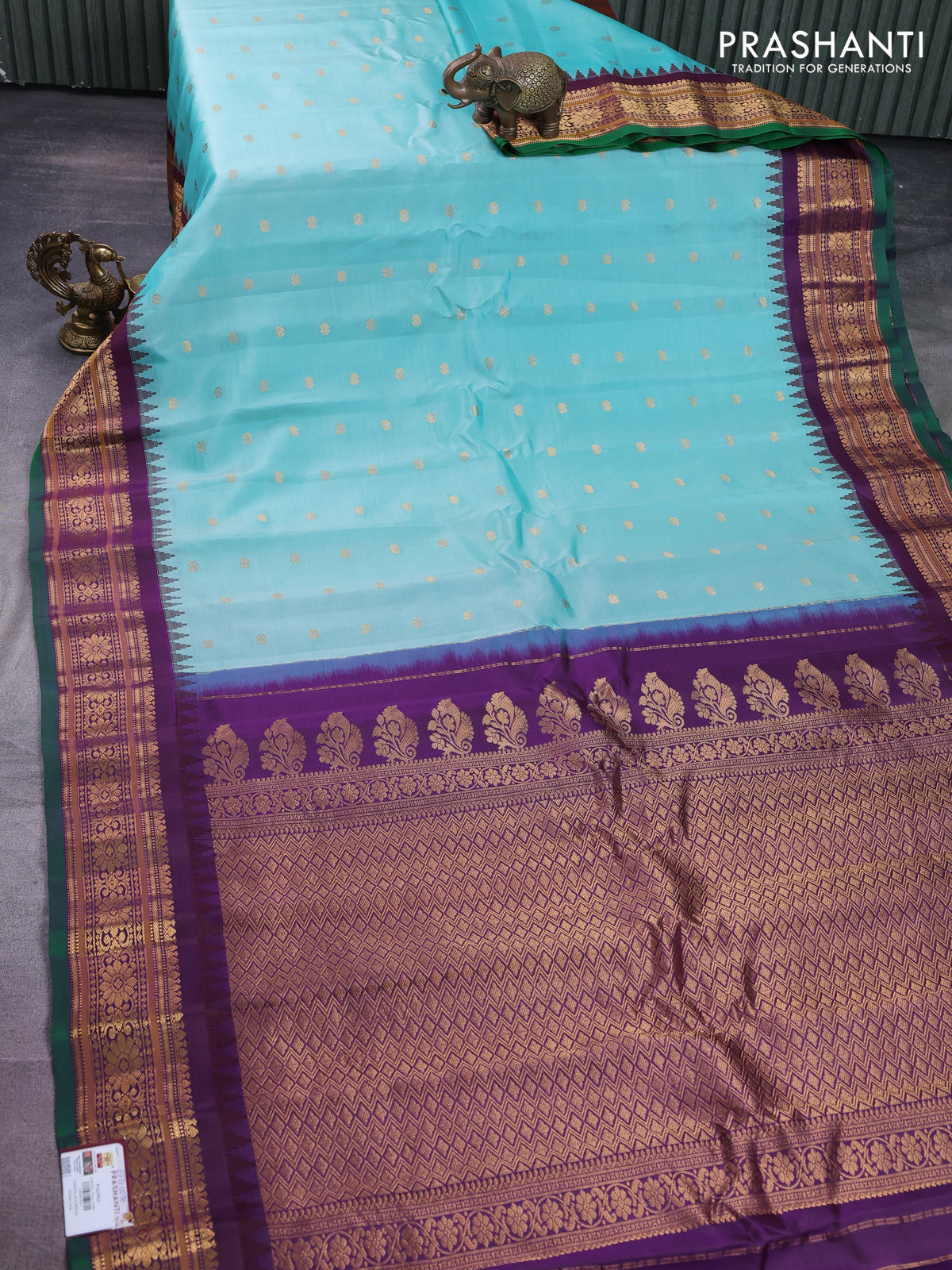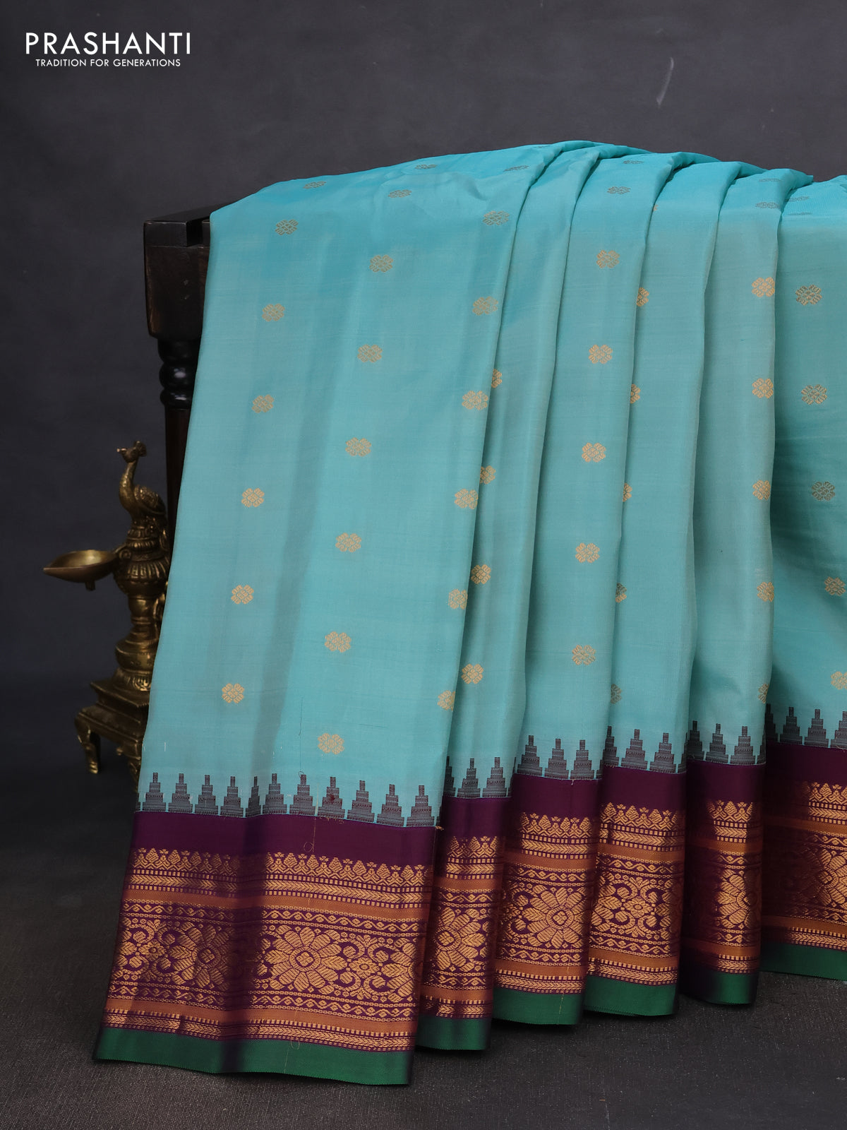 Pure gadwal silk saree teal blue and wine shade with floral zari woven buttas and temple design zari woven border