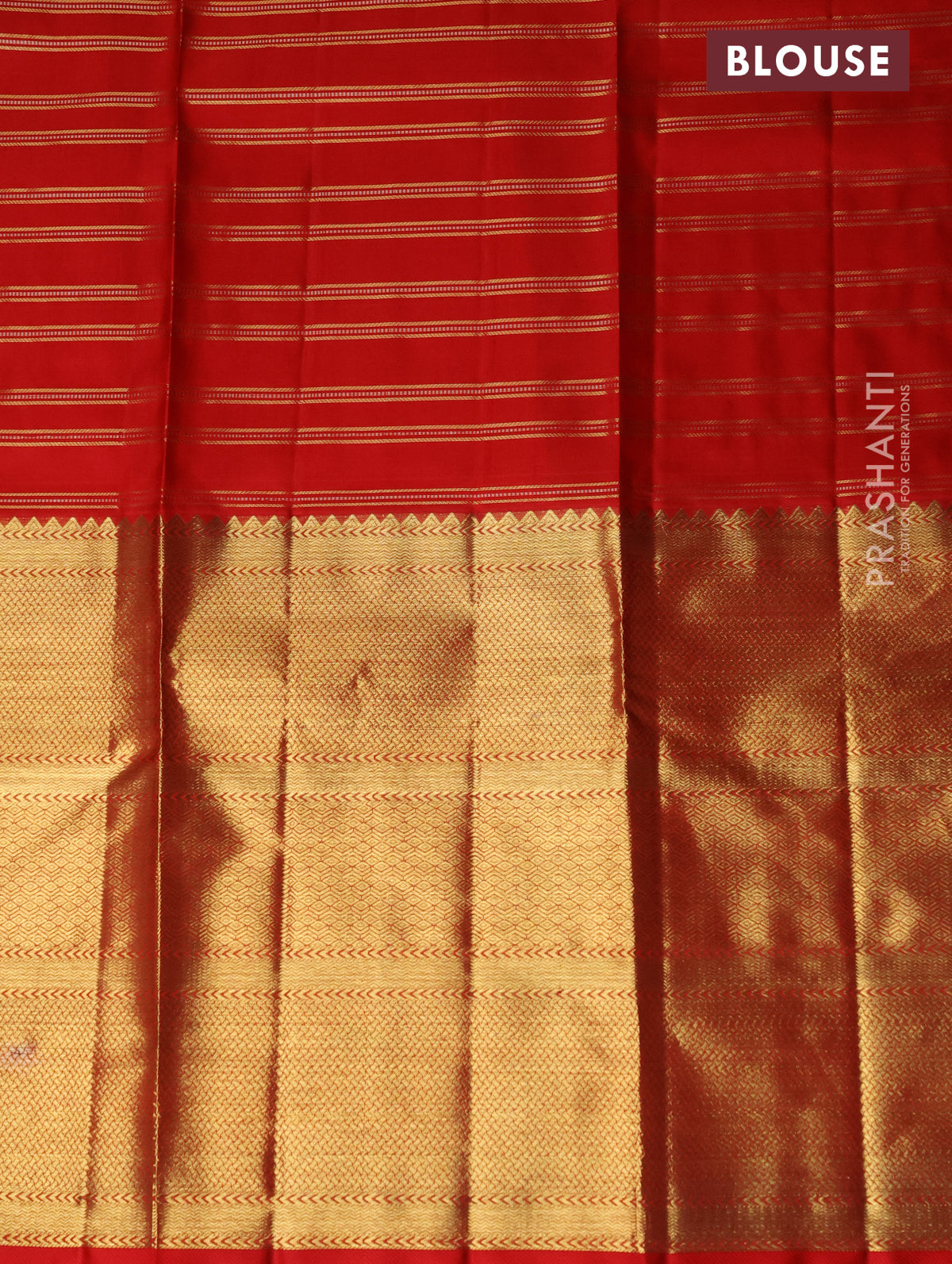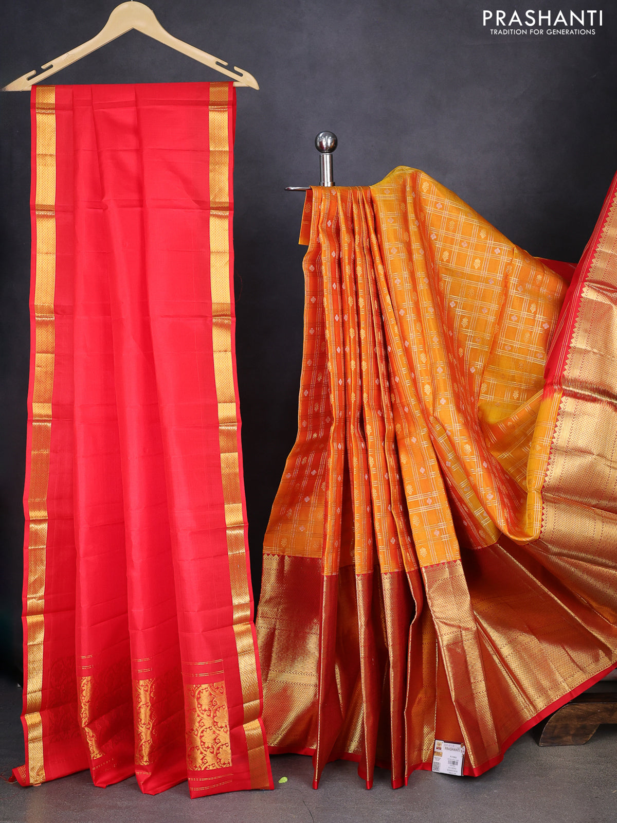 Pure kanchipuram silk lehenga dual shade of mustard yellow and red with allover zari checks & buttas and long zari woven border