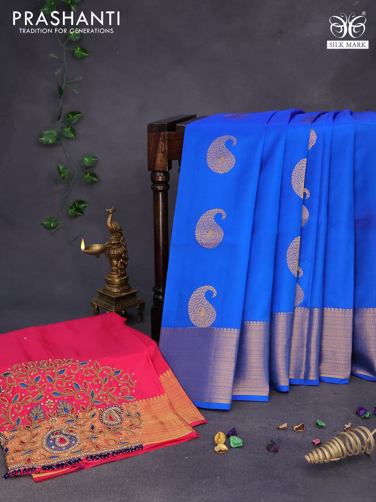 Pure kanchipuram silk saree blue and pink with paisley zari woven buttas and zari woven border & embroidery work blouse