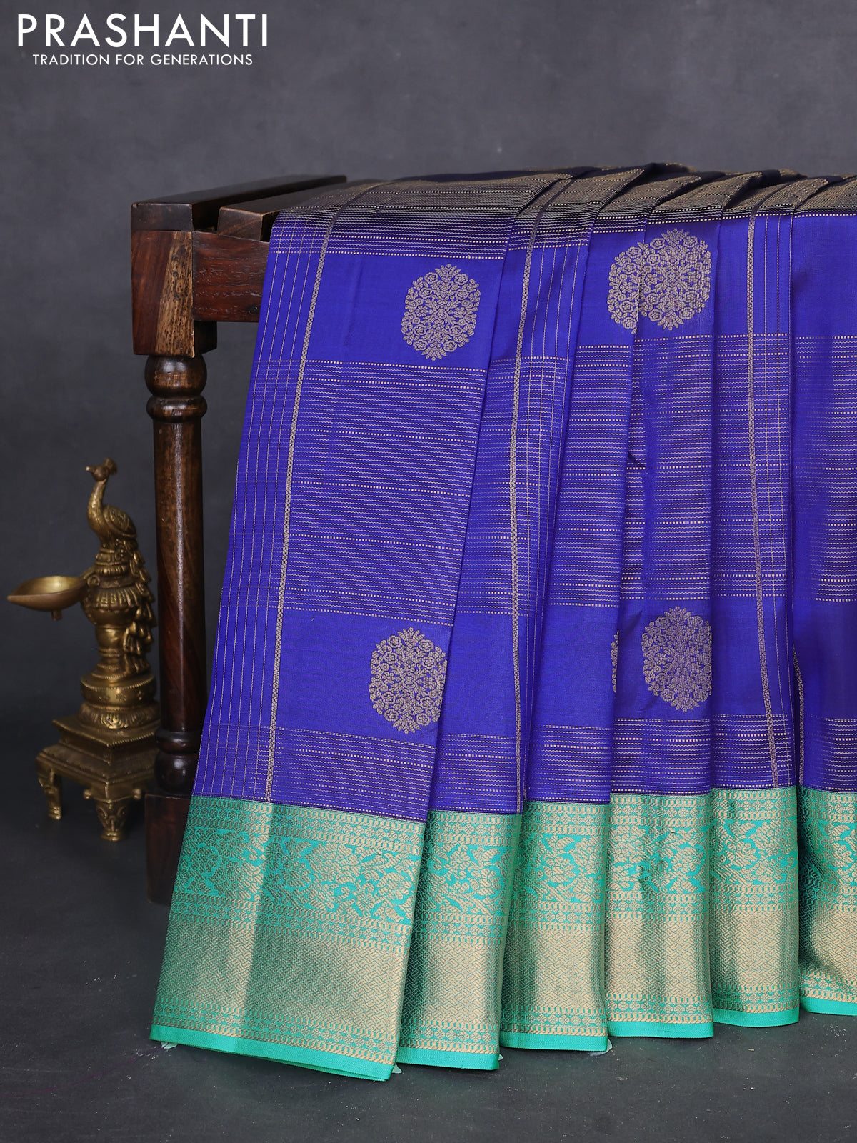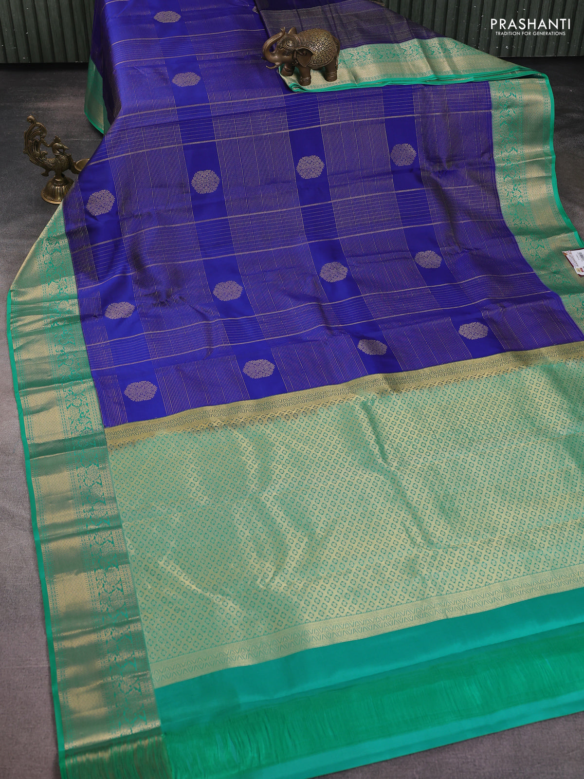 Pure kanchipuram silk saree blue and teal blue with allover zari checks & buttas and zari woven korvai border