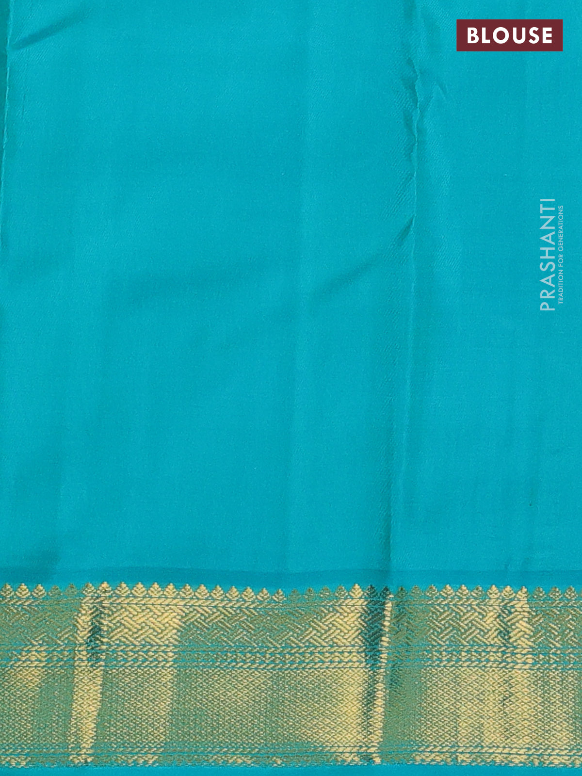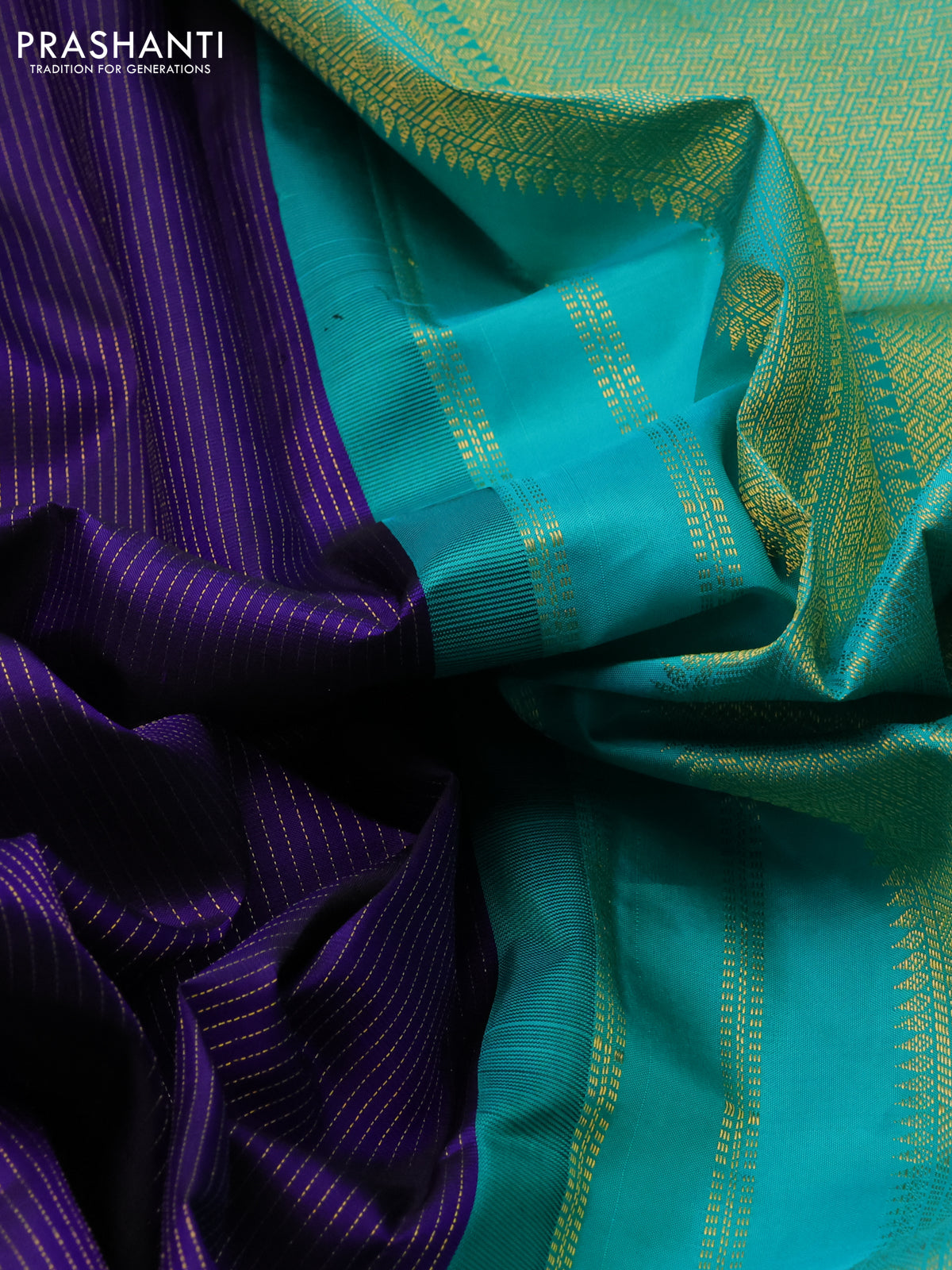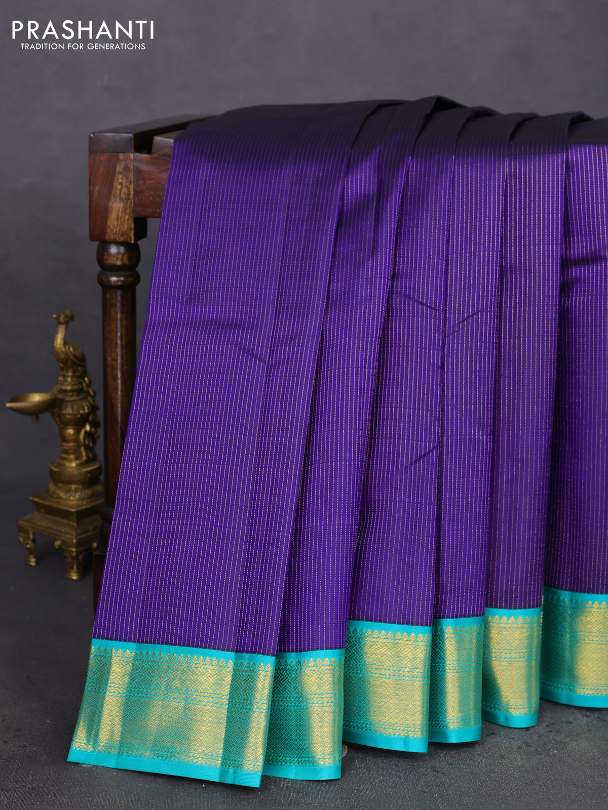 Pure kanchipuram silk saree blue and teal blue with allover zari stripes pattern and zari woven korvai border