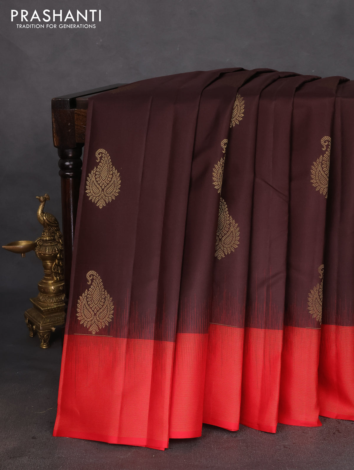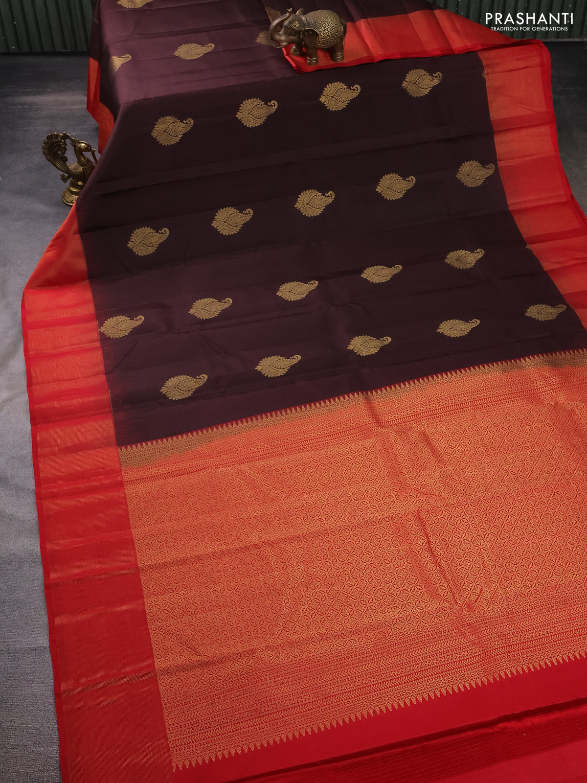 Pure kanchipuram silk saree brown and red with zari woven buttas and zari woven simple border