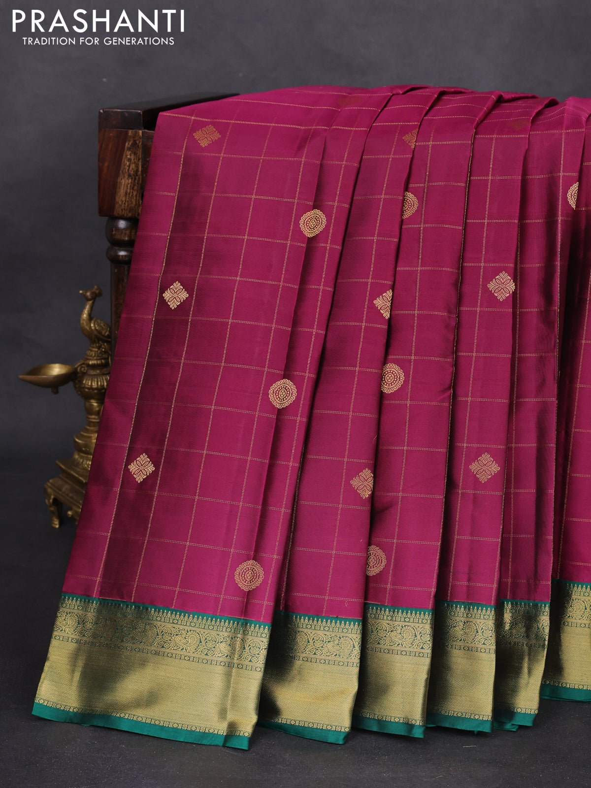 Pure kanchipuram silk saree dark magenta pink and green with allover checks & zari buttas and zari woven korvai border