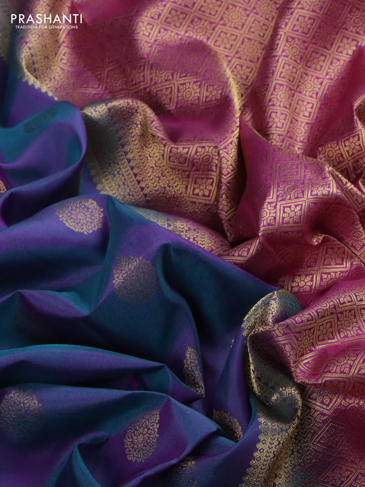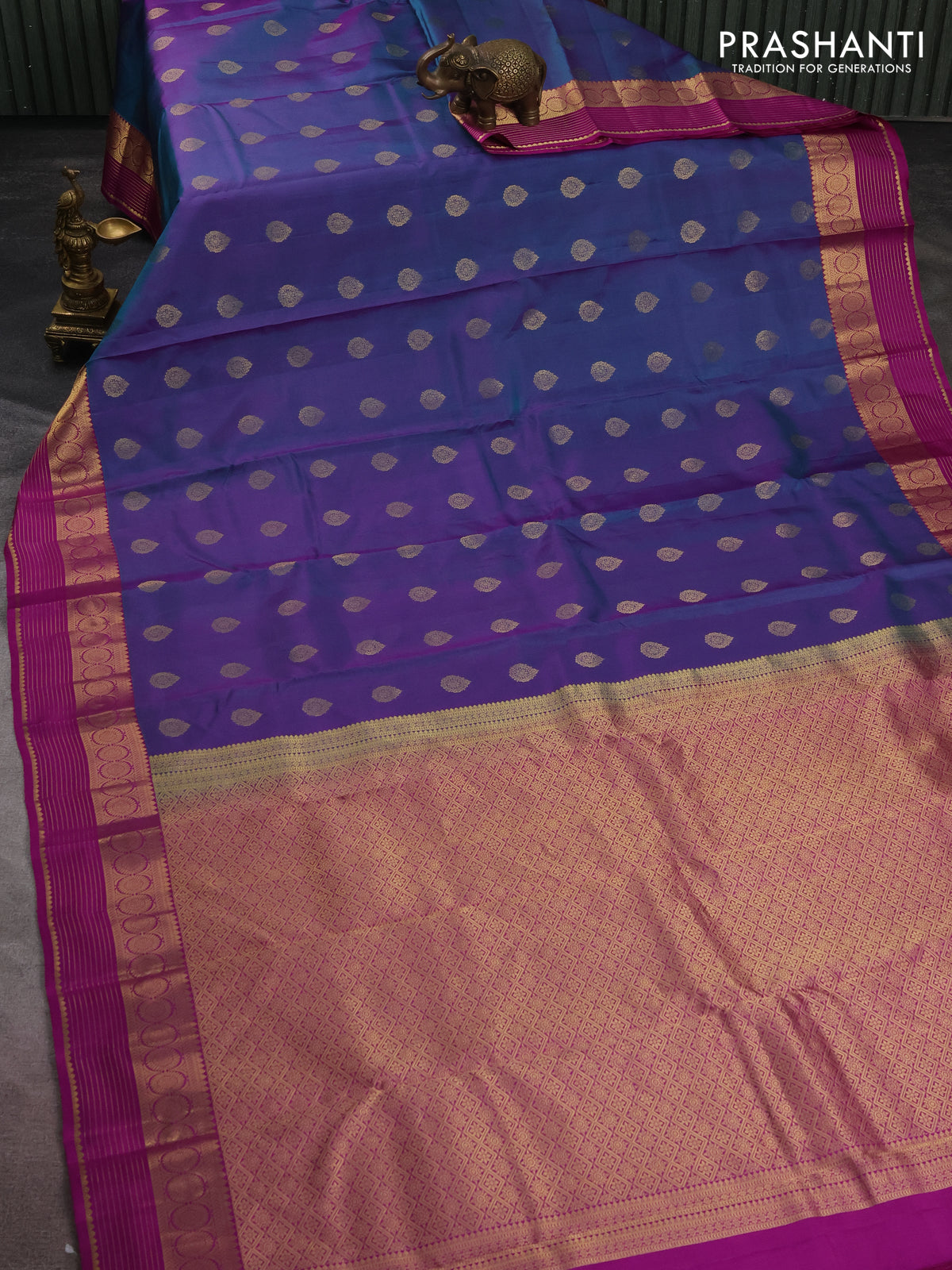 Pure kanchipuram silk saree dual shade of blue and purple with zari woven buttas and rich zari woven border