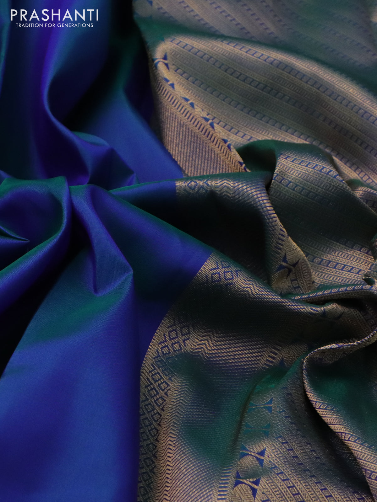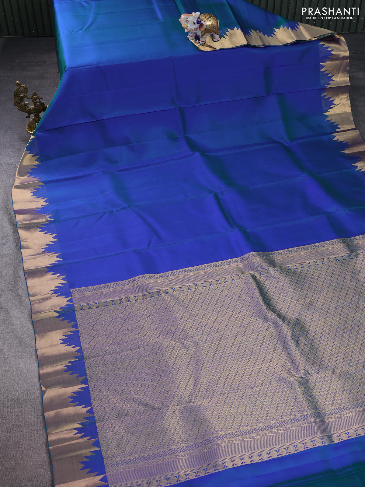 Pure kanchipuram silk saree dual shade of bluish green with plain body and temple zari woven border