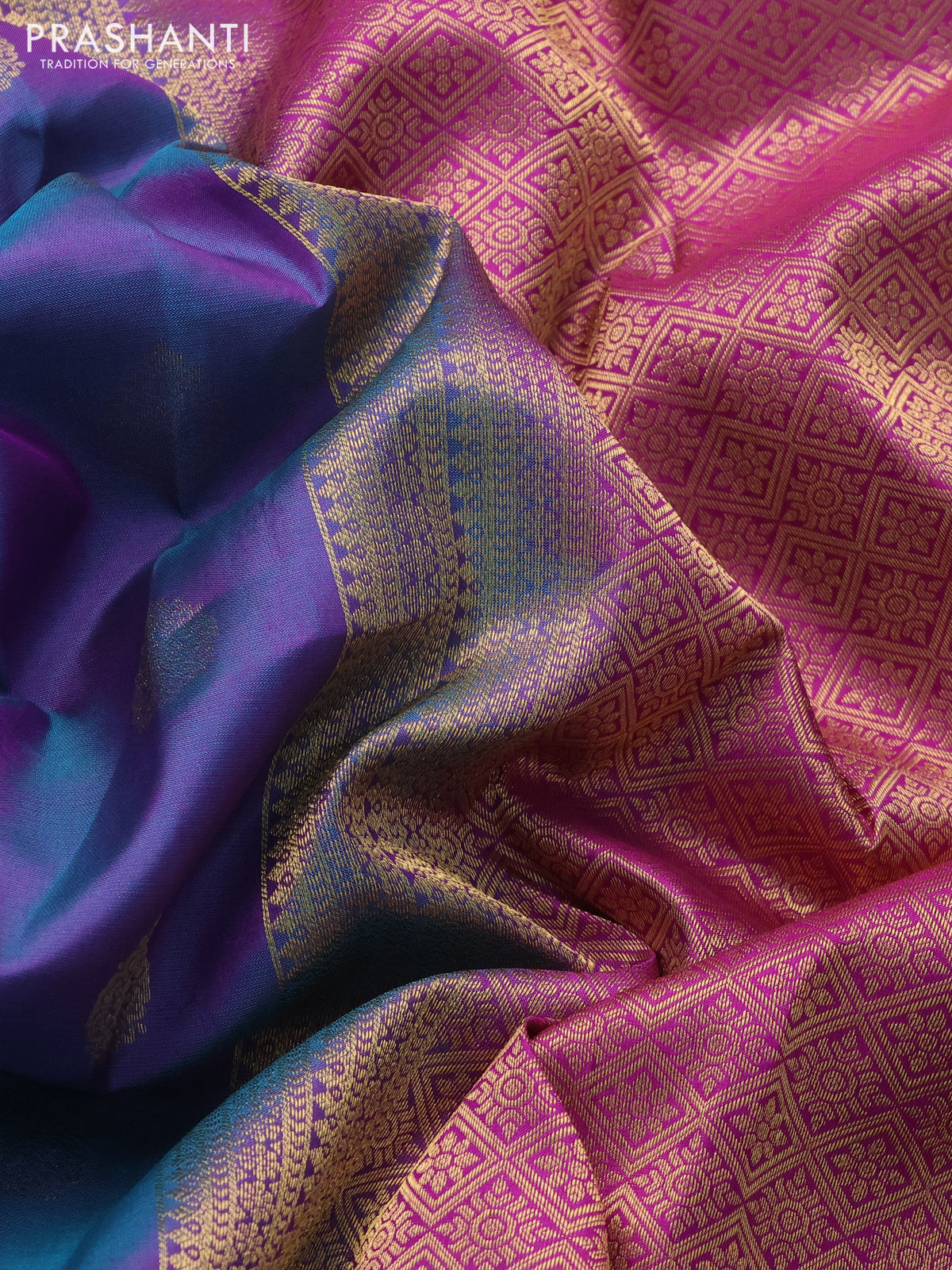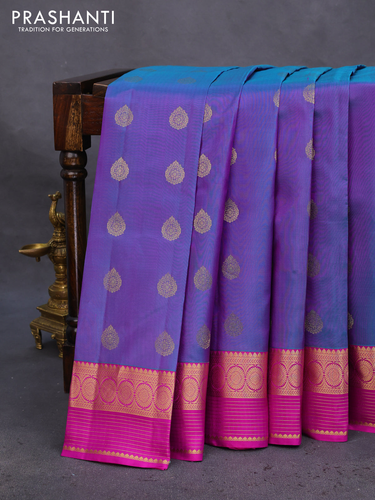 Pure kanchipuram silk saree dual shade of bluish purple and purple with allover zari woven buttas and zari woven border