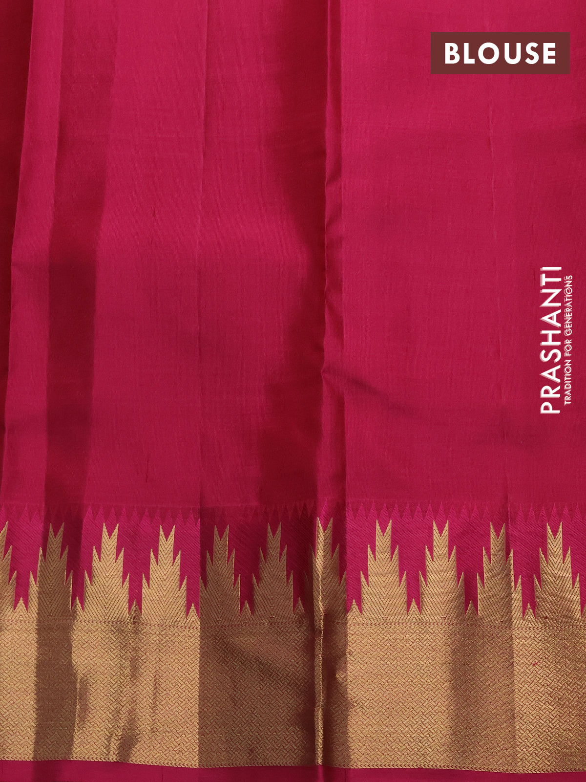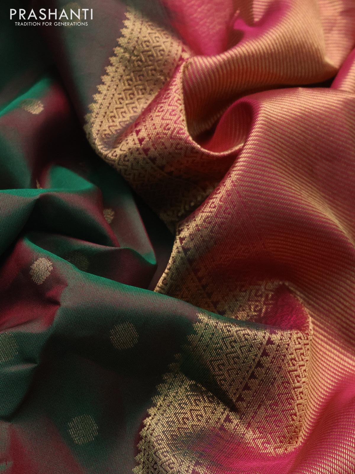 Pure kanchipuram silk saree dual shade of green and dark pink with allover zari woven buttas and temple design zari woven border