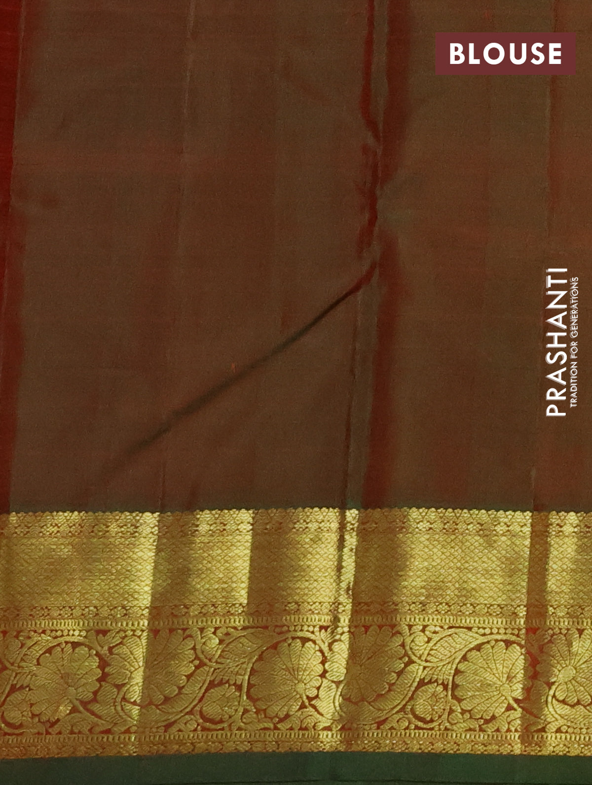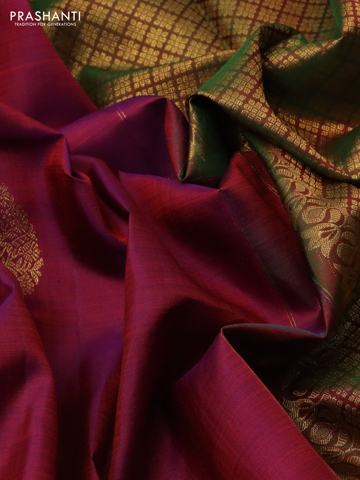 Pure kanchipuram silk saree dual shade of maroonish blue and dual shade of green with zari woven buttas and floral design zari woven border