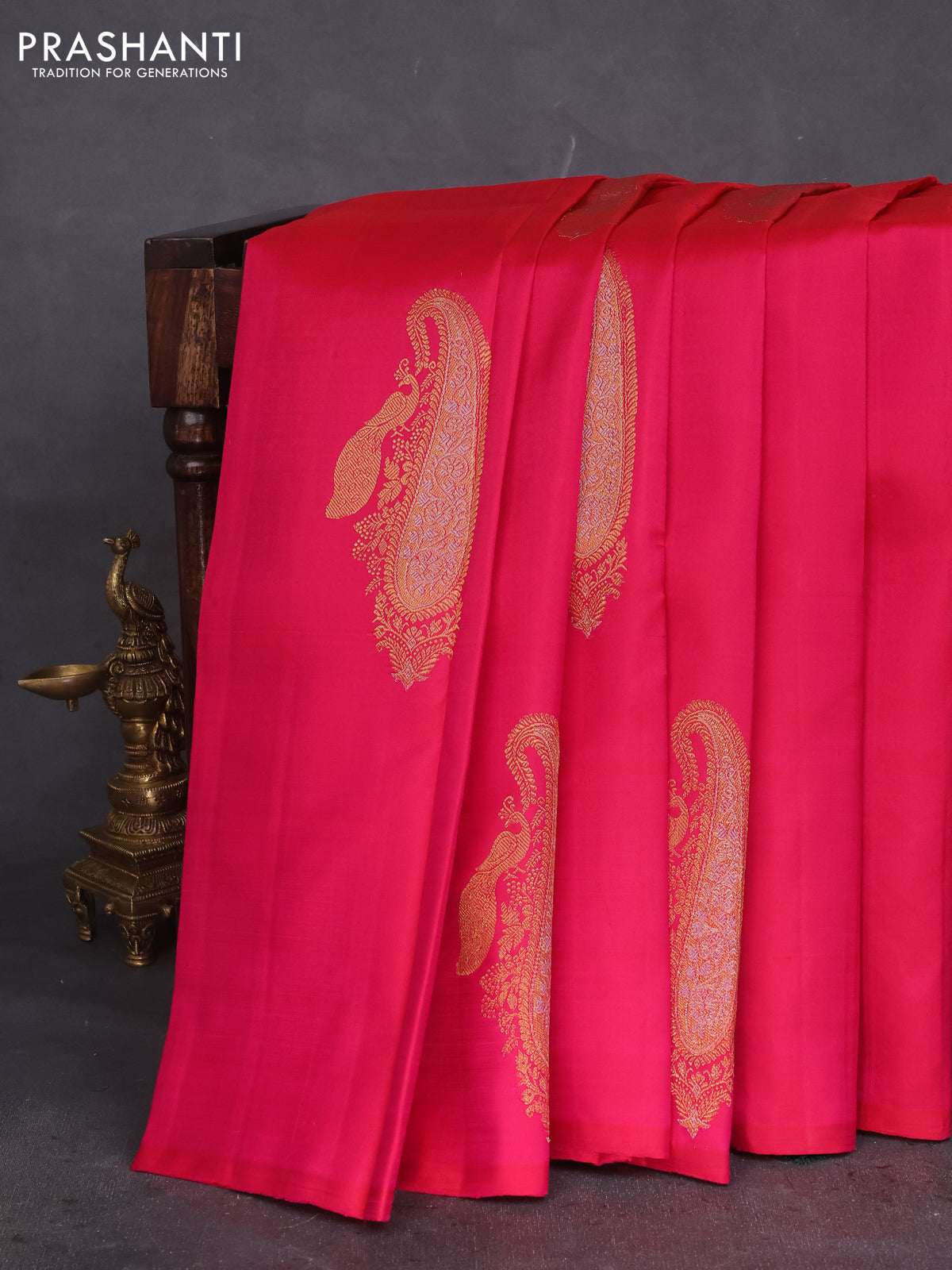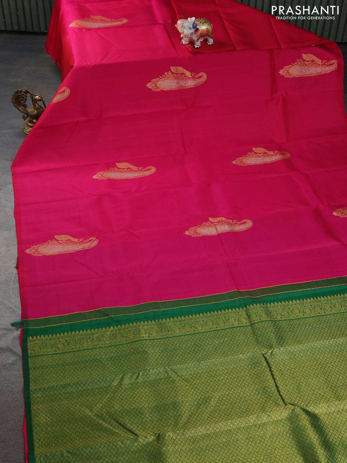 Pure kanchipuram silk saree dual shade of pink and green with zari woven buttas in borderless style