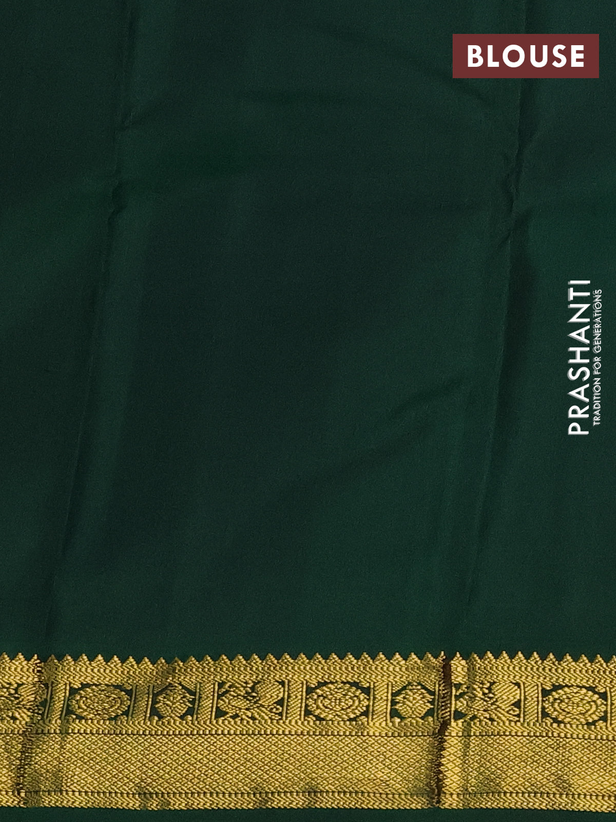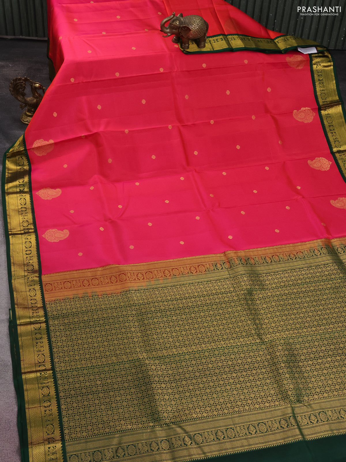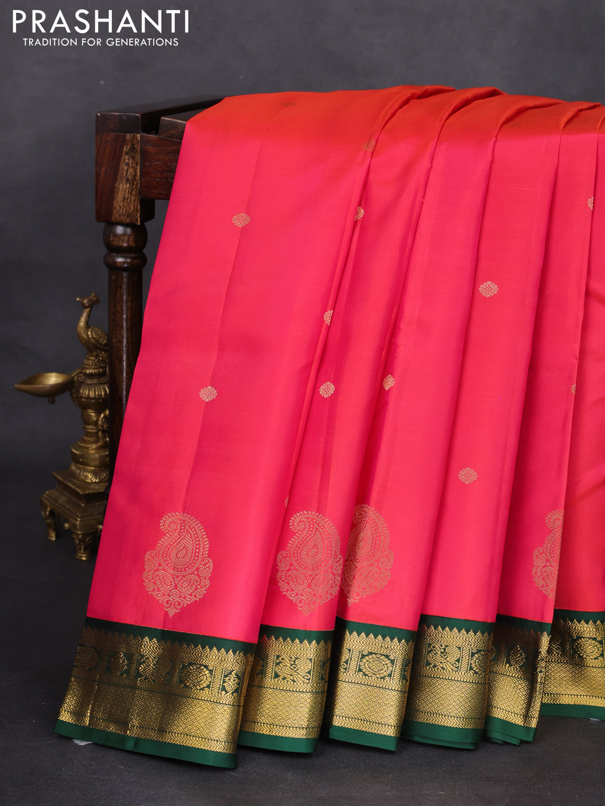 Pure kanchipuram silk saree dual shade of pinkish orange and dark green with zari woven buttas and zari woven korvai border