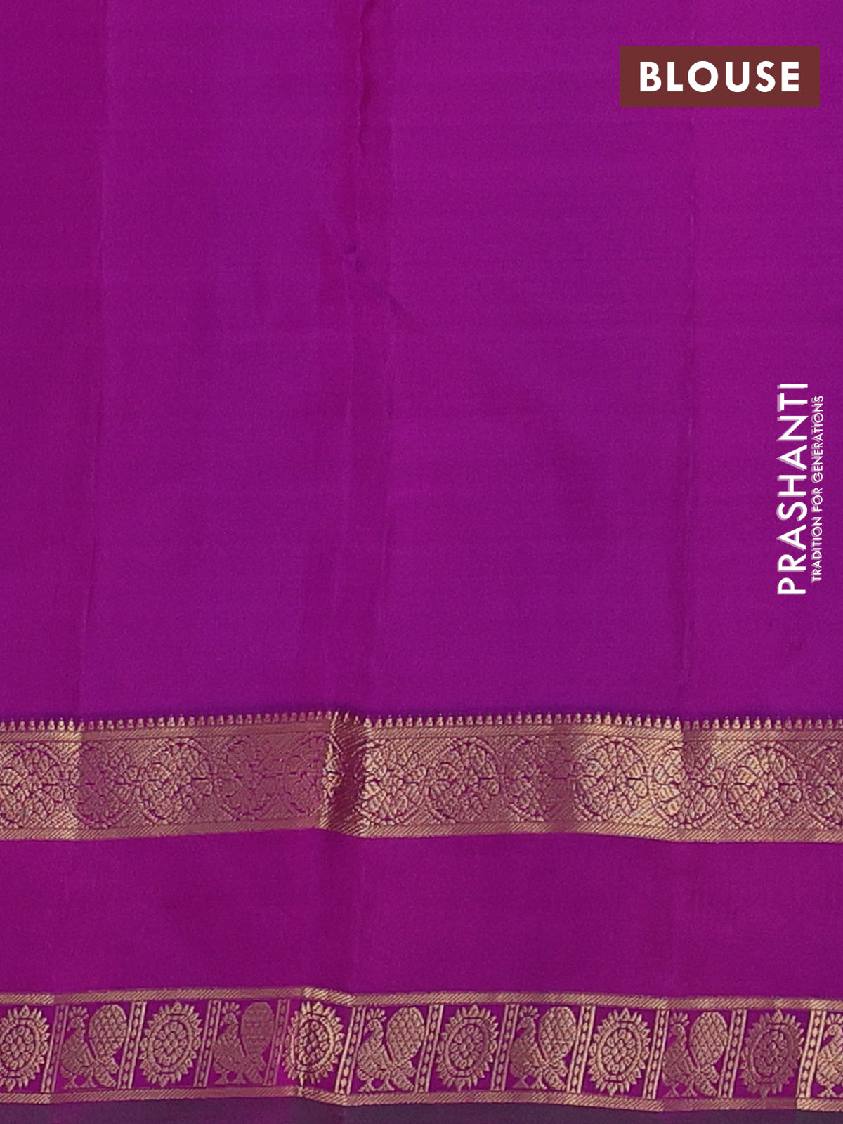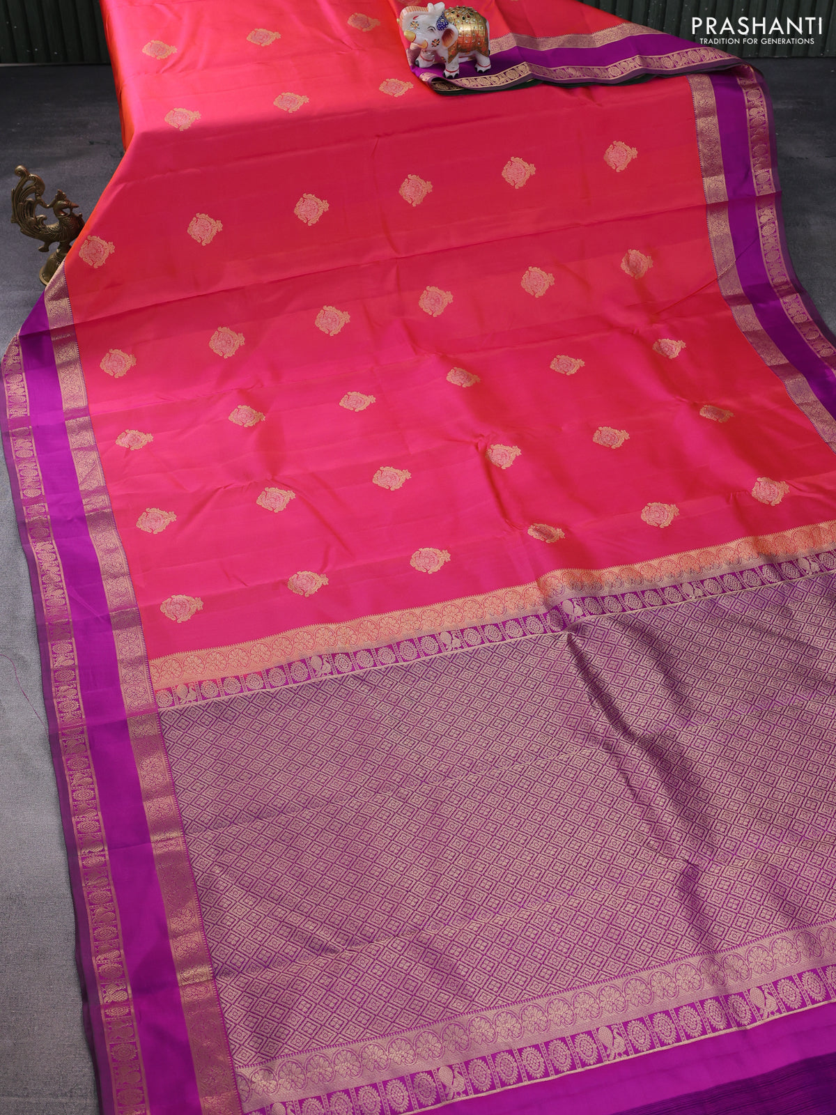 Pure kanchipuram silk saree dual shade of pinkish orange and purple with zari woven buttas and rettapet zari woven border